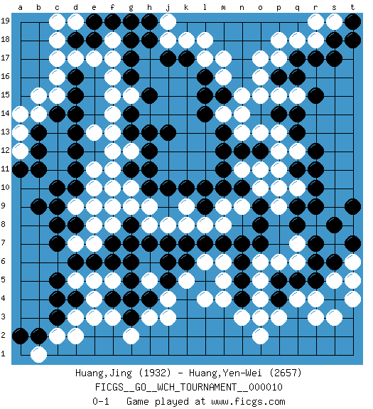 Last move : 0-1 2014 May 27 12:13:1 [Event "FICGS__GO__WCH_TOURNAMENT__000010"] [Site "FICGS"] [Date "2013.07.02"] [Round "1"] [Black "Huang,Jing"] [White "Huang,Yen-Wei"] [Result "0-1"] [Rating 1 "1932"] [Rating 2 "2657"] 1.q16 d17 2.d4 q4 3.d15 c15 4.c14 c16 5.d14 f17 6.d10 f3 7.d6 d2 8.c3 j3 9.r6 o4 10.s4 r3 11.r9 o17 12.q14 q18 13.r17 m16 14.g16 f16 15.g14 g15 16.h15 f15 17.j13 f10 18.h10 f14 19.g13 f13 20.d12 e11 21.d11 q10 22.q9 o10 23.q11 l4 24.k17 l17 25.l15 k18 26.l16 m17 27.o8 p11 28.r11 n14 29.o12 m9 30.n10 n9 31.o9 n11 32.m10 o11 33.l9 m8 34.l10 o13 35.m7 l8 36.l7 k8 37.k7 j8 38.j7 h9 39.j10 g10 40.m13 p12 41.g8 g9 42.h4 h3 43.f4 f8 44.f7 e8 45.c8 r18 46.s18 s3 47.j17 s19 48.s17 c2 49.b2 j18 50.g17 b1 51.g3 g2 52.g4 e3 53.a2 b14 54.b13 b15 55.g18 s5 56.s6 t4 57.e18 f18 58.f19 d19 59.d18 c18 60.e19 c19 61.q17 p17 62.q13 g12 63.h13 a13 64.b12 a12 65.a11 a14 66.b11 j4 67.j5 g7 68.g6 h8 69.h7 e7 70.f6 p6 71.n4 m4 72.n5 n3 73.n12 p13 74.m11 m14 75.l14 n13 76.m12 q7 77.r7 k5 78.k6 m5 79.n6 d3 80.c4 e5 81.e6 e4 82.q8 h5 83.j6 c9 84.d8 d9 85.e9 e10 86.b9 f9 87.c10 p15 88.p16 o16 89.p14 o15 90.r10 p10 91.g11 f11 92.h11 q15 93.r15 q12 94.r12 t6 95.t7 t5 96.r5 r4 97.p5 o5 98.q5 o6 99.p4 p3 100.o7 q6 101.s8 f5 102.g5 d5 103.c5 d7 104.c7 m6 105.n7 l6 106.e9 d9 107.h18 k9 108.k10 e13 109.m15 n15 110.d13 j19 111.h12 f12 112.d16 e17 113.g19 p9 114.g8 t8 115.t9 g7 116.o3 o2 117.g8 c17 118.g7 p18 119.t18 o3 120.c9 e9 121.t19 r19 122.h19 l18 0-1 Here are the names of the openings (joseki) played in the four corners : Corner d16 : d17 d15 Komoku (Somok, Xiao~mu`) 3-4 Point. The komoku (3-4) point is the traditional corner enclosure move.. Ikken Takagakari (Hankan Nop'dakeolch'im, Yi Gaogua`jiao~, 1-Space High Approach). The 5-4 approach move has become more popular in modern times, as modern Go emphasizes speed and influence. Corner d4 : d4 f3 Hoshi (Hwajeom, Seongjeom, Xingwei`) 4-4 Point. The star or hoshi (4-4) point, emphasizing influence at the potential expense of territory. Ikken Kakari (Hankan Keolch'im, Yi Gua`jiao~, 1-Space Low Approach). White 2 is the standard approach move to the 4-4. Corner q4 : q4 r6 Hoshi (Hwajeom, Seongjeom, Xingwei`) 4-4 Point. The star or hoshi (4-4) point, emphasizing influence at the potential expense of territory. Ikken Kakari (Hankan Keolch'im, Yi Gua`jiao~, 1-Space Low Approach). Black 2 is the standard approach move to the 4-4. Corner q16 : q16 o17 Hoshi (Hwajeom, Seongjeom, Xingwei`) 4-4 Point. The star or hoshi (4-4) point, emphasizing influence at the potential expense of territory. Ikken Kakari (Hankan Keolch'im, Yi Gua`jiao~, 1-Space Low Approach). White 2 is the standard approach move to the 4-4. Player White won this Go (weiqi, baduk) game. Follow this game move after move (download)The weak player fears ko, the strong player seeks it. (Bill Taylor) All maxims have their antagonist maxims; proverbs should be sold in pairs, a single one being but a half truth. (William Mathews)
