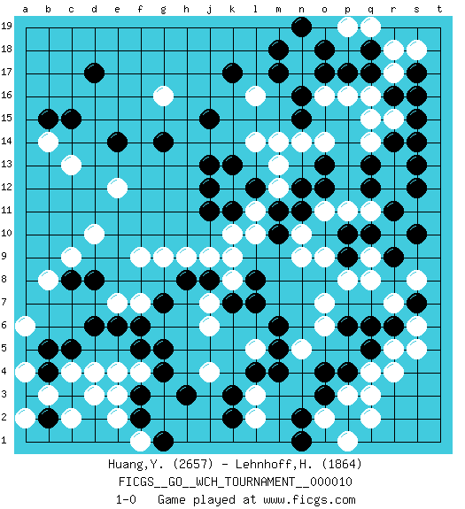 Last move : 1-0 2014 January 21 1:3:50 [Event "FICGS__GO__WCH_TOURNAMENT__000010"] [Site "FICGS"] [Date "2013.07.02"] [Round "1"] [Black "Huang,Yen-Wei"] [White "Lehnhoff,Heinz-Georg"] [Result "1-0"] [Rating 1 "2657"] [Rating 2 "1864"] 1.r16 d4 2.d17 q4 3.c15 p16 4.p17 q16 5.q17 r15 6.o17 o16 7.n16 r17 8.s16 r18 9.s17 s18 10.s15 n17 11.n15 q14 12.r14 q15 13.q13 r13 14.s14 o14 15.q18 q19 16.o18 r12 17.q12 q11 18.o12 p11 19.o13 n14 20.m17 m12 21.r11 o11 22.s12 r10 23.s13 l14 24.n11 n10 25.m11 l11 26.m10 n9 27.n12 d10 28.o3 p3 29.o4 l3 30.q5 r4 31.p4 r5 32.q6 c13 33.r6 s6 34.s7 q2 35.p2 q3 36.p9 o6 37.p6 o7 38.q10 q9 39.p10 m13 40.f3 f4 41.g4 e3 42.f5 e4 43.g5 f7 44.e6 e7 45.d6 l5 46.c8 c9 47.d8 j4 48.c5 b3 49.f2 e2 50.h3 p8 51.r9 q8 52.s10 a6 53.b4 c4 54.b5 b8 55.a3 a2 56.b2 a4 57.c3 c2 58.a3 n18 59.m18 b3 60.l7 d3 61.m6 n5 62.m5 j6 63.g7 k8 64.l8 j9 65.h8 f9 66.k7 j7 67.j8 k9 68.f6 s5 69.m4 h9 70.k2 p19 71.n19 l2 72.k3 r7 73.l4 s8 74.e14 b14 75.b15 o2 76.n2 p1 77.j15 l16 78.k17 g16 79.g14 e12 80.j13 k12 81.n1 f1 82.g1 o9 83.j12 g9 84.j11 k10 85.k13 m14 86.k11 l10 87.l12 1-0 Here are the names of the openings (joseki) played in the four corners : Corner q16 : r16 p16 Komoku (Somok, Xiao~mu`) 3-4 Point. The komoku (3-4) point is the traditional corner enclosure move.. Ikken Takagakari (Hankan Nop'dakeolch'im, Yi Gaogua`jiao~, 1-Space High Approach). The 5-4 approach move has become more popular in modern times, as modern Go emphasizes speed and influence. Corner d4 : d4 f3 Hoshi (Hwajeom, Seongjeom, Xingwei`) 4-4 Point. The star or hoshi (4-4) point, emphasizing influence at the potential expense of territory. Ikken Kakari (Hankan Keolch'im, Yi Gua`jiao~, 1-Space Low Approach). Black 2 is the standard approach move to the 4-4. Player Black won this Go (weiqi, baduk) game. Follow this game move after move (download)When your opponent has two weak groups, attack them both at once. (Anonymous) All men can see these tactics whereby I conquer, but what none can see is the strategy out of which victory is evolved. (Sun Tzu)