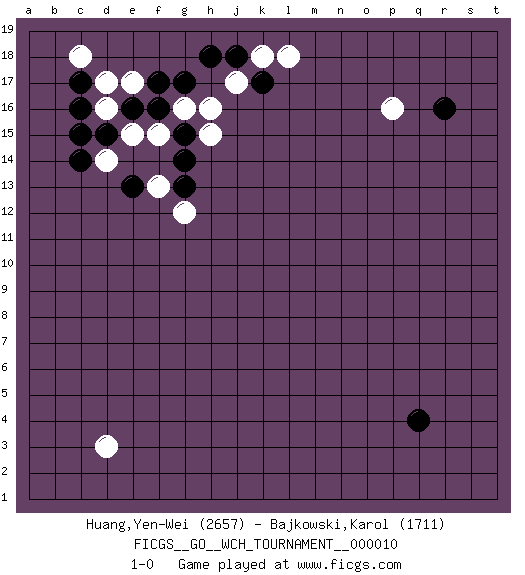 Last move : 1-0 2013 August 4 10:53:4 [Event "FICGS__GO__WCH_TOURNAMENT__000010"] [Site "FICGS"] [Date "2013.07.02"] [Round "1"] [Black "Huang,Yen-Wei"] [White "Bajkowski,Karol"] [Result "1-0"] [Rating 1 "2657"] [Rating 2 "1711"] 1.r16 d16 2.q4 d3 3.f17 p16 4.c14 e15 5.c17 d17 6.c16 g16 7.d15 d14 8.c15 c18 9.e16 e17 10.f16 f15 11.g17 h16 12.j18 j17 13.h18 k18 14.k17 l18 15.g15 h15 16.g14 f13 17.g13 g12 18.e13 1-0 Here are the names of the openings (joseki) played in the four corners : Corner d16 : d16 f17 Hoshi (Hwajeom, Seongjeom, Xingwei`) 4-4 Point. The star or hoshi (4-4) point, emphasizing influence at the potential expense of territory. Ikken Kakari (Hankan Keolch'im, Yi Gua`jiao~, 1-Space Low Approach). Black 2 is the standard approach move to the 4-4. Corner q16 : r16 p16 Komoku (Somok, Xiao~mu`) 3-4 Point. The komoku (3-4) point is the traditional corner enclosure move.. Ikken Takagakari (Hankan Nop'dakeolch'im, Yi Gaogua`jiao~, 1-Space High Approach). The 5-4 approach move has become more popular in modern times, as modern Go emphasizes speed and influence. Player Black won this Go (weiqi, baduk) game. Follow this game move after move (download)There is damezumari at the bamboo joint. (Anonymous) Success without honor is an unseasoned dish; it will satisfy your hunger, but it won't taste good. (Joe Paterno)