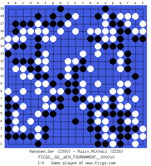 Last move : 1-0 2013 August 21 13:7:47 [Event "FICGS__GO__WCH_TOURNAMENT__000010"] [Site "FICGS"] [Date "2013.07.02"] [Round "1"] [Black "Hanssen,Ger"] [White "Ruzin,Mikhail"] [Result "1-0"] [Rating 1 "2300"] [Rating 2 "2226"] 1.q16 d4 2.q3 d16 3.f3 c6 4.k4 r6 5.q5 s4 6.r8 q6 7.r5 s5 8.r3 s7 9.p6 q8 10.p7 q9 11.r11 r9 12.f5 o17 13.q14 k16 14.c14 c10 15.c17 c16 16.d17 e16 17.b16 b15 18.b17 c15 19.f17 g15 20.g17 j17 21.b14 e3 22.f2 a14 23.b12 b11 24.a13 a15 25.e14 f15 26.d11 c11 27.c12 d10 28.e11 f13 29.e13 r17 30.q17 q18 31.r16 s18 32.s17 r18 33.o16 n16 34.n15 m16 35.l7 f7 36.g7 g8 37.h7 f6 38.g5 o15 39.o14 f11 40.e15 f16 41.e10 e9 42.f10 e12 43.d12 f12 44.h10 j12 45.g9 q11 46.r12 p15 47.p14 n14 48.m15 p16 49.p17 n13 50.q15 o16 51.p18 s16 52.s15 t17 53.t15 h8 54.j8 t16 55.f8 e8 56.d2 c3 57.c2 b3 58.b2 n9 59.k11 k12 60.l11 n7 61.n6 m7 62.m6 l8 63.k8 l9 64.a3 j11 65.k10 l6 66.k7 j10 67.k9 f9 68.j9 g6 69.h6 s2 70.s3 t3 71.r2 r4 72.q4 o6 73.o5 o7 74.a5 a6 75.b6 b5 76.a7 b7 77.a6 a8 78.a4 b4 79.a2 c8 80.s10 n5 81.m5 n4 82.m4 o4 83.p5 p2 84.n3 o3 85.n2 o2 86.m3 p8 87.q1 t2 88.o1 p1 89.n1 h18 90.g18 e17 91.e18 m11 92.l12 l13 93.h17 h16 94.j18 k18 95.h19 e2 96.e1 s1 97.q2 q7 98.p3 e5 99.n18 o18 100.o19 q12 101.p12 q13 102.r13 1-0 Here are the names of the openings (joseki) played in the four corners : Corner d4 : d4 f3 Hoshi (Hwajeom, Seongjeom, Xingwei`) 4-4 Point. The star or hoshi (4-4) point, emphasizing influence at the potential expense of territory. Ikken Kakari (Hankan Keolch'im, Yi Gua`jiao~, 1-Space Low Approach). Black 2 is the standard approach move to the 4-4. Corner q4 : q3 r6 Komoku (Somok, Xiao~mu`) 3-4 Point. The komoku (3-4) point is the traditional corner enclosure move.. Niken Kakari (Dukan Keolch'im, E`r Gua`jiao~, 2-Space Low Approach). White 2 is used with friendly forces backing it up. Its purpose is to prevent a pincer. Locally it results in a loss, but may be appropriate fuseki strategy. It was popular in the late 1950s and early 1960s, but is not seen often nowadays, having been replaced by the one-space high approach, with which it has points in common. Corner d16 : d16 c14 Hoshi (Hwajeom, Seongjeom, Xingwei`) 4-4 Point. The star or hoshi (4-4) point, emphasizing influence at the potential expense of territory. Ikken Kakari (Hankan Keolch'im, Yi Gua`jiao~, 1-Space Low Approach). Black 2 is the standard approach move to the 4-4. Player Black won this Go (weiqi, baduk) game. Follow this game move after move (download)Never try to cut bamboo joints. (Anonymous) The problem with manipulation is that people can turn on you. (Horatio Caine, C.S.I. Miami)