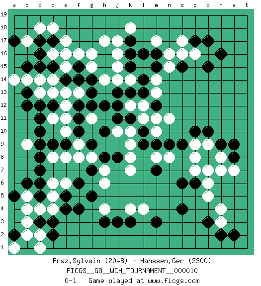 Last move : 0-1 2013 October 15 17:16:43 [Event "FICGS__GO__WCH_TOURNAMENT__000010"] [Site "FICGS"] [Date "2013.07.02"] [Round "1"] [Black "Praz,Sylvain"] [White "Hanssen,Ger"] [Result "0-1"] [Rating 1 "2048"] [Rating 2 "2300"] 1.r16 d16 2.q3 p16 3.p17 o17 4.q17 c4 5.e4 d6 6.c3 b3 7.d3 b5 8.j3 n16 9.o15 o16 10.q15 j17 11.r9 q5 12.o4 r3 13.r2 r4 14.s2 r7 15.o6 p7 16.p6 q6 17.q8 q7 18.s8 s7 19.o9 n8 20.m7 r8 21.s9 q9 22.q10 p9 23.p10 p8 24.f6 h6 25.g7 h7 26.h8 k7 27.j8 h4 28.h3 f5 29.e5 k4 30.k3 l4 31.m3 k8 32.c8 d8 33.d9 e8 34.c7 e6 35.f4 d11 36.e9 f9 37.c10 g8 38.c11 d13 39.d12 e12 40.c12 e13 41.f10 e10 42.g9 f8 43.f11 e11 44.h10 j10 45.j11 k10 46.h12 g11 47.g12 c13 48.c6 d5 49.c5 d4 50.g5 b9 51.c9 c2 52.d2 c1 53.a2 b2 54.b6 a1 55.a5 b4 56.d17 e17 57.c16 d18 58.c17 c18 59.b13 b14 60.b12 c14 61.h16 h14 62.g14 g15 63.h15 j14 64.f14 f16 65.f12 l12 66.f15 g16 67.d15 e16 68.c15 e15 69.e14 d14 70.b15 a14 71.a17 b17 72.k11 l11 73.l10 m10 74.l9 k9 75.k13 k12 76.j13 m14 77.k15 f13 78.l13 m13 79.m15 n15 80.k17 h17 81.m9 m8 82.g13 j15 83.k16 j16 84.j12 m17 85.n9 n11 86.m16 k14 87.l14 l15 88.l16 k18 89.m12 m11 0-1 Ger Hanssen Interesting game. I think F12 was certainly the losing move. Sylvain Praz yeah, missread the capuring races Sylvain Praz but was fun, thx Here are the names of the openings (joseki) played in the four corners : Corner q16 : r16 p16 Komoku (Somok, Xiao~mu`) 3-4 Point. The komoku (3-4) point is the traditional corner enclosure move.. Ikken Takagakari (Hankan Nop'dakeolch'im, Yi Gaogua`jiao~, 1-Space High Approach). The 5-4 approach move has become more popular in modern times, as modern Go emphasizes speed and influence. Corner d4 : c4 e4 Komoku (Somok, Xiao~mu`) 3-4 Point. The komoku (3-4) point is the traditional corner enclosure move.. Ikken Takagakari (Hankan Nop'dakeolch'im, Yi Gaogua`jiao~, 1-Space High Approach). The 5-4 approach move has become more popular in modern times, as modern Go emphasizes speed and influence. Player White won this Go (weiqi, baduk) game. Follow this game move after move (download)One big eye kills one small eye. (Anonymous) Perception is reality. (Immanuel Kant)