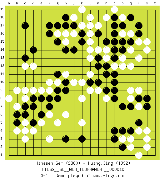 Last move : 0-1 2014 January 17 11:14:42 [Event "FICGS__GO__WCH_TOURNAMENT__000010"] [Site "FICGS"] [Date "2013.07.02"] [Round "1"] [Black "Hanssen,Ger"] [White "Huang,Jing"] [Result "0-1"] [Rating 1 "2300"] [Rating 2 "1932"] 1.r16 d4 2.c17 r4 3.o4 p3 4.c6 d9 5.e8 e9 6.f8 f9 7.g8 f3 8.g9 c8 9.c4 c3 10.d5 b4 11.b5 c5 12.p4 c4 13.r3 q3 14.q4 s3 15.r2 s2 16.r5 s4 17.o3 q2 18.p2 r1 19.d14 c12 20.c13 d12 21.f17 p16 22.m16 r15 23.q15 q16 24.r14 s15 25.r17 s14 26.p15 o15 27.q13 r13 28.o16 q14 29.p14 p13 30.o14 q12 31.n15 n13 32.k3 g16 33.f16 j16 34.g15 h15 35.g17 r7 36.p7 k5 37.h3 h6 38.c7 e5 39.e6 d6 40.d7 f6 41.d5 g5 42.o13 o12 43.n12 n14 44.o15 l14 45.o11 p12 46.m12 l13 47.h14 h16 48.j14 l16 49.k15 l15 50.k16 k17 51.j17 m17 52.m13 m14 53.o17 n18 54.k18 p18 55.o18 o19 56.p17 l17 57.q18 j18 58.h17 l18 59.h18 k19 60.r8 q8 61.q7 r9 62.s8 q9 63.s7 n10 64.m10 m9 65.l10 j10 66.g11 l9 67.n9 k10 68.o10 n8 69.o9 l11 70.n11 k8 71.o8 g10 72.h10 f10 73.h9 h11 74.b8 b9 75.d8 c9 76.f7 b7 77.b6 a8 0-1 Here are the names of the openings (joseki) played in the four corners : Corner q4 : r4 o4 Komoku (Somok, Xiao~mu`) 3-4 Point. The komoku (3-4) point is the traditional corner enclosure move.. Niken Takagakari (Dukan Nop'dakeolch'im, E`r Gaojia, 2-Space High Approch). The great master Honinbo Shuei (1852-1906) favored the two-space high (niken taka-gakari) approach, especially in two stone handicap games. This approach move was very popular in the 1910s. Wu Qingyuan = Go Seigen frequently played this way, considering it a good "whole board" approach. In recent years, O Rissei has often used the two-space high approach. Corner d4 : d4 c6 Hoshi (Hwajeom, Seongjeom, Xingwei`) 4-4 Point. The star or hoshi (4-4) point, emphasizing influence at the potential expense of territory. Ikken Kakari (Hankan Keolch'im, Yi Gua`jiao~, 1-Space Low Approach). Black 2 is the standard approach move to the 4-4. Corner q16 : r16 p16 Komoku (Somok, Xiao~mu`) 3-4 Point. The komoku (3-4) point is the traditional corner enclosure move.. Ikken Takagakari (Hankan Nop'dakeolch'im, Yi Gaogua`jiao~, 1-Space High Approach). The 5-4 approach move has become more popular in modern times, as modern Go emphasizes speed and influence. Player White won this Go (weiqi, baduk) game. Follow this game move after move (download)Always remember, keep the balance. [between territory and influence] (Figaro) Looking at the proliferation of personal web pages on the Net, it looks like very soon everyone on Earth will have 15 megabytes of fame. (M.G. Sriram)