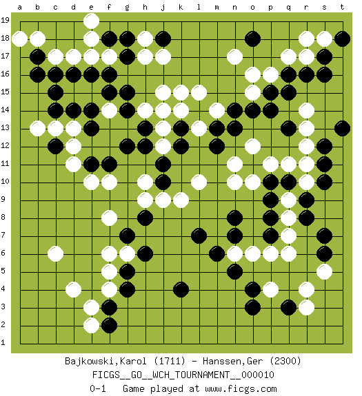 Last move : 0-1 2013 September 28 11:59:50 [Event "FICGS__GO__WCH_TOURNAMENT__000010"] [Site "FICGS"] [Date "2013.07.02"] [Round "1"] [Black "Bajkowski,Karol"] [White "Hanssen,Ger"] [Result "0-1"] [Rating 1 "1711"] [Rating 2 "2300"] 1.q16 d4 2.q3 d17 3.f3 c6 4.k4 q6 5.o4 r14 6.q10 o16 7.p15 o15 8.p14 r17 9.r16 q17 10.s17 s18 11.s16 p16 12.o14 r12 13.q13 r13 14.t18 r18 15.q15 q11 16.p10 p11 17.o11 r10 18.r9 q9 19.s10 r11 20.r8 o10 21.p9 q8 22.s6 n10 23.p8 q7 24.p7 p6 25.n8 n6 26.n7 o12 27.n14 n11 28.n5 l15 29.l14 k15 30.o18 n17 31.m12 l10 32.k12 o6 33.m6 p4 34.o3 s5 35.s7 r4 36.s11 r3 37.j10 k9 38.l7 j9 39.s12 h10 40.j11 h9 41.g12 e10 42.c15 d15 43.d14 e15 44.c16 c17 45.c12 d13 46.e14 c13 47.c14 b13 48.f15 f17 49.g17 f14 50.e13 d12 51.g15 j13 52.j14 k14 53.k13 m14 54.m13 l13 55.n13 h14 56.g14 j17 57.f18 e18 58.f16 e17 59.j18 j12 60.h13 j15 61.h12 j14 62.t13 h18 63.g18 h17 64.b17 b18 65.b16 a18 66.e16 f4 67.g4 f5 68.g5 g6 69.h6 e3 70.g7 f6 71.h8 f8 72.f2 e2 73.d16 e19 74.e11 d11 75.f11 f10 0-1 Here are the names of the openings (joseki) played in the four corners : Corner d4 : d4 f3 Hoshi (Hwajeom, Seongjeom, Xingwei`) 4-4 Point. The star or hoshi (4-4) point, emphasizing influence at the potential expense of territory. Ikken Kakari (Hankan Keolch'im, Yi Gua`jiao~, 1-Space Low Approach). Black 2 is the standard approach move to the 4-4. Corner q4 : q3 q6 Komoku (Somok, Xiao~mu`) 3-4 Point. The komoku (3-4) point is the traditional corner enclosure move.. Niken Takagakari (Dukan Nop'dakeolch'im, E`r Gaojia, 2-Space High Approch). The great master Honinbo Shuei (1852-1906) favored the two-space high (niken taka-gakari) approach, especially in two stone handicap games. This approach move was very popular in the 1910s. Wu Qingyuan = Go Seigen frequently played this way, considering it a good "whole board" approach. In recent years, O Rissei has often used the two-space high approach. Corner q16 : q16 r14 Hoshi (Hwajeom, Seongjeom, Xingwei`) 4-4 Point. The star or hoshi (4-4) point, emphasizing influence at the potential expense of territory. Ikken Kakari (Hankan Keolch'im, Yi Gua`jiao~, 1-Space Low Approach). White 2 is the standard approach move to the 4-4. Corner d16 : d17 j11 Komoku (Somok, Xiao~mu`) 3-4 Point. The komoku (3-4) point is the traditional corner enclosure move.. Player White won this Go (weiqi, baduk) game. Follow this game move after move (download)Learn to play under the stones. (Anonymous) The good fighters of old first put themselves beyond the possibility of defeat, and then waited for an opportunity of defeating the enemy. (Sun Tzu)