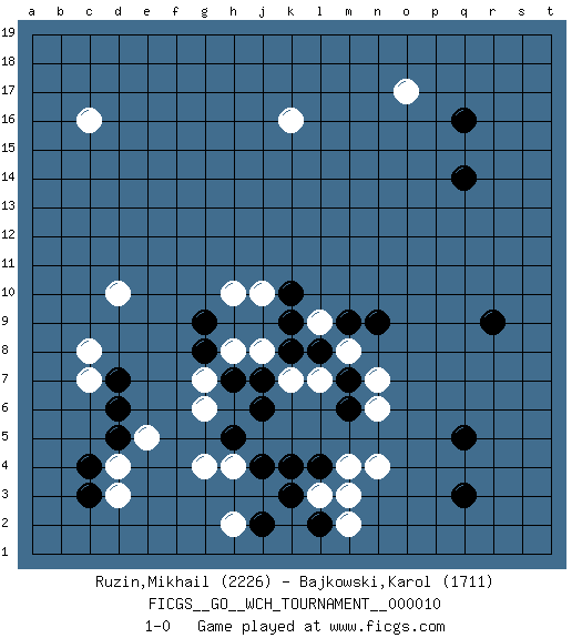 Last move : 1-0 2013 July 24 19:59:14 [Event "FICGS__GO__WCH_TOURNAMENT__000010"] [Site "FICGS"] [Date "2013.07.02"] [Round "1"] [Black "Ruzin,Mikhail"] [White "Bajkowski,Karol"] [Result "1-0"] [Rating 1 "2226"] [Rating 2 "1711"] 1.q16 d3 2.q3 c16 3.r9 o17 4.q14 k16 5.k4 d10 6.d5 c7 7.c3 d4 8.c4 e5 9.d6 h4 10.h5 g4 11.d7 c8 12.j4 n4 13.q5 n7 14.n9 m8 15.m9 l9 16.l8 l7 17.k8 k7 18.j7 j8 19.k9 h8 20.h7 g7 21.g8 j10 22.k10 g6 23.j6 l3 24.l4 m4 25.l2 m3 26.k3 h2 27.j2 m2 28.m6 n6 29.g9 h10 30.m7 1-0 Here are the names of the openings (joseki) played in the four corners : Corner q16 : q16 o17 Hoshi (Hwajeom, Seongjeom, Xingwei`) 4-4 Point. The star or hoshi (4-4) point, emphasizing influence at the potential expense of territory. Ikken Kakari (Hankan Keolch'im, Yi Gua`jiao~, 1-Space Low Approach). White 2 is the standard approach move to the 4-4. Corner d4 : d3 d5 Komoku (Somok, Xiao~mu`) 3-4 Point. The komoku (3-4) point is the traditional corner enclosure move.. Ikken Takagakari (Hankan Nop'dakeolch'im, Yi Gaogua`jiao~, 1-Space High Approach). The 5-4 approach move has become more popular in modern times, as modern Go emphasizes speed and influence. Player Black won this Go (weiqi, baduk) game. Follow this game move after move (download)Go is to western chess what philosophy is to double entry accounting. (from Shibumi, by Trevanian) Everybody lies. (Gregory House, House M.D.)