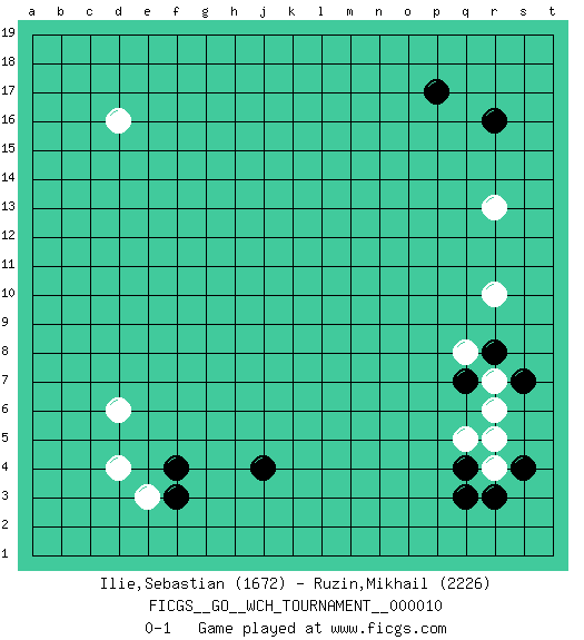 Last move : 0-1 2013 August 30 0:58:50 [Event "FICGS__GO__WCH_TOURNAMENT__000010"] [Site "FICGS"] [Date "2013.07.02"] [Round "1"] [Black "Ilie,Sebastian"] [White "Ruzin,Mikhail"] [Result "0-1"] [Rating 1 "1672"] [Rating 2 "2226"] 1.r16 d16 2.q3 d4 3.p17 r10 4.r8 r13 5.f3 e3 6.f4 d6 7.j4 q5 8.q4 r5 9.s4 r4 10.r3 q8 11.q7 r7 12.s7 r6 0-1 This go game has been lost on time (started : 2013.07.02 23:31:25) Here are the names of the openings (joseki) played in the four corners : Corner d4 : d4 f3 Hoshi (Hwajeom, Seongjeom, Xingwei`) 4-4 Point. The star or hoshi (4-4) point, emphasizing influence at the potential expense of territory. Ikken Kakari (Hankan Keolch'im, Yi Gua`jiao~, 1-Space Low Approach). Black 2 is the standard approach move to the 4-4. Player White won this Go (weiqi, baduk) game. Follow this game move after move (download)Eyes win semiais. (Anonymous) Gambling : The sure way of getting nothing from something. (Wilson Mizner)