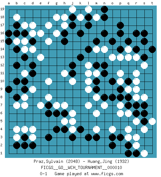 Last move : 0-1 2013 November 25 12:38:58 [Event "FICGS__GO__WCH_TOURNAMENT__000010"] [Site "FICGS"] [Date "2013.07.02"] [Round "1"] [Black "Praz,Sylvain"] [White "Huang,Jing"] [Result "0-1"] [Rating 1 "2048"] [Rating 2 "1932"] 1.r16 d4 2.c16 q4 3.p17 r10 4.o3 q6 5.q2 r3 6.l3 e16 7.g17 f15 8.c13 c17 9.b17 d17 10.k16 b15 11.b16 c15 12.d15 d16 13.a15 d14 14.b14 c14 15.b12 b18 16.a16 c11 17.d12 e13 18.c9 r13 19.f3 c7 20.c3 d3 21.d2 c4 22.b2 b3 23.c2 e7 24.d11 b9 25.b8 c8 26.b10 d9 27.c10 b7 28.n16 m4 29.m3 o4 30.p3 n14 31.q10 r11 32.q8 q9 33.p9 r9 34.q7 p6 35.o8 m8 36.m7 n7 37.s7 l7 38.r6 r5 39.s5 s4 40.m9 l9 41.n8 m6 42.m10 l10 43.m12 m11 44.n11 l11 45.n12 r15 46.s16 p15 47.p16 h17 48.j17 h18 49.h16 g18 50.k13 k18 51.l17 m18 52.j18 j19 53.l18 l19 54.n18 g16 55.n19 f17 56.h4 j4 57.k4 j5 58.j3 h5 59.g4 f10 60.j12 h11 61.j11 j10 62.f6 g7 63.f7 f8 64.g6 h7 65.h6 j6 66.s15 s14 67.q15 q14 68.r14 q13 69.o15 o13 70.p14 p13 71.s13 s12 72.t14 p10 73.o10 p11 74.h15 b4 75.a9 r2 76.r1 s1 77.q1 q3 78.o2 t5 79.s6 r8 80.r7 p7 81.p8 s8 82.m15 m14 83.l14 l12 0-1 Here are the names of the openings (joseki) played in the four corners : Corner q4 : q4 o3 Hoshi (Hwajeom, Seongjeom, Xingwei`) 4-4 Point. The star or hoshi (4-4) point, emphasizing influence at the potential expense of territory. Ikken Kakari (Hankan Keolch'im, Yi Gua`jiao~, 1-Space Low Approach). Black 2 is the standard approach move to the 4-4. Corner d16 : c16 e16 Komoku (Somok, Xiao~mu`) 3-4 Point. The komoku (3-4) point is the traditional corner enclosure move.. Ikken Takagakari (Hankan Nop'dakeolch'im, Yi Gaogua`jiao~, 1-Space High Approach). The 5-4 approach move has become more popular in modern times, as modern Go emphasizes speed and influence. Corner d4 : d4 c9 Hoshi (Hwajeom, Seongjeom, Xingwei`) 4-4 Point. The star or hoshi (4-4) point, emphasizing influence at the potential expense of territory. Player White won this Go (weiqi, baduk) game. Follow this game move after move (download)Corner, side, centre. (Anonymous) No, no, you're not thinking; you're just being logical. (Niels Bohr)