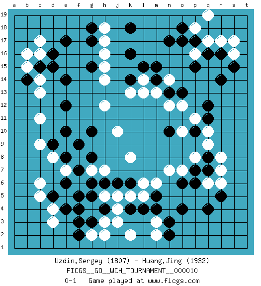 Last move : 0-1 2014 January 8 22:43:38 [Event "FICGS__GO__WCH_TOURNAMENT__000010"] [Site "FICGS"] [Date "2013.07.02"] [Round "1"] [Black "Uzdin,Sergey"] [White "Huang,Jing"] [Result "0-1"] [Rating 1 "1807"] [Rating 2 "1932"] 1.q16 d3 2.d5 c16 3.q4 d8 4.f4 e5 5.e4 d4 6.e6 c5 7.f5 c6 8.e17 h16 9.e14 c13 10.k16 h14 11.d16 c17 12.c15 b15 13.b14 c14 14.d15 b16 15.e12 c11 16.k14 h12 17.e10 f8 18.g10 j10 19.g15 h15 20.g18 h18 21.g17 h17 22.n17 k13 23.k4 r6 24.r5 q6 25.o4 q10 26.q12 r17 27.r16 q17 28.p17 p18 29.o18 p16 30.o17 s16 31.s15 s17 32.r14 q19 33.p15 l14 34.l15 m13 35.m14 l13 36.d9 c9 37.k18 n14 38.m15 h3 39.f2 h5 40.k6 k2 41.h6 m3 42.n2 m2 43.m5 g2 44.g3 g4 45.f3 j5 46.j6 k5 47.l4 l5 48.g5 j3 49.m4 l6 50.n3 m6 51.n13 n12 52.o13 k8 53.p10 q9 54.n10 g7 55.g6 h2 56.f7 e7 57.g8 h7 58.f9 f6 59.h4 j4 60.f7 o12 61.e8 p11 62.o6 o7 63.p7 n7 64.p6 p8 65.q7 r7 66.q8 r8 67.q11 o10 0-1 This go game has been lost on time (started : 2013.07.02 23:31:25) Here are the names of the openings (joseki) played in the four corners : Corner d4 : d3 d5 Komoku (Somok, Xiao~mu`) 3-4 Point. The komoku (3-4) point is the traditional corner enclosure move.. Ikken Takagakari (Hankan Nop'dakeolch'im, Yi Gaogua`jiao~, 1-Space High Approach). The 5-4 approach move has become more popular in modern times, as modern Go emphasizes speed and influence. Corner d16 : c16 e17 Komoku (Somok, Xiao~mu`) 3-4 Point. The komoku (3-4) point is the traditional corner enclosure move.. Ikken Kakari (Hankan Keolch'im, Yi Gua`jiao~, 1-Space Low Pincer). The small knight move is the basic approach move to the 3-4 point stone. It has been continually used for over four centuries. There are limitless variations, with new moves constantly being discovered. Black 2 opens the door to a treaure store of joseki. Corner q4 : q4 r6 Hoshi (Hwajeom, Seongjeom, Xingwei`) 4-4 Point. The star or hoshi (4-4) point, emphasizing influence at the potential expense of territory. Ikken Kakari (Hankan Keolch'im, Yi Gua`jiao~, 1-Space Low Approach). White 2 is the standard approach move to the 4-4. Player White won this Go (weiqi, baduk) game. Follow this game move after move (download)Don't make dango's. (Anonymous) As a goal marker shodan is important. As a destination it is a poor place to stop. (Thomas Tamayo)