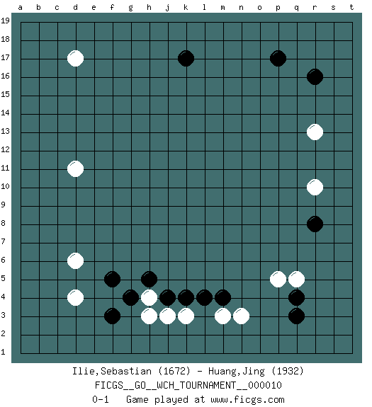 Last move : 0-1 2013 September 16 1:56:42 [Event "FICGS__GO__WCH_TOURNAMENT__000010"] [Site "FICGS"] [Date "2013.07.02"] [Round "1"] [Black "Ilie,Sebastian"] [White "Huang,Jing"] [Result "0-1"] [Rating 1 "1672"] [Rating 2 "1932"] 1.r16 d4 2.q3 d17 3.p17 r10 4.r8 r13 5.k17 d11 6.f3 h3 7.f5 d6 8.j4 j3 9.k4 k3 10.l4 h4 11.h5 m3 12.m4 n3 13.g4 q5 14.q4 p5 0-1 This go game has been lost on time (started : 2013.07.02 23:31:25) Here are the names of the openings (joseki) played in the four corners : Corner d4 : d4 f3 Hoshi (Hwajeom, Seongjeom, Xingwei`) 4-4 Point. The star or hoshi (4-4) point, emphasizing influence at the potential expense of territory. Ikken Kakari (Hankan Keolch'im, Yi Gua`jiao~, 1-Space Low Approach). Black 2 is the standard approach move to the 4-4. Player White won this Go (weiqi, baduk) game. Follow this game move after move (download)The nature of a game comes from what is played, but it's the sensitivity to the possible and the impossible that gives it value. (Pierre Audouard) You can't play chess if you're groggy from pills. (Anatoly Karpov)