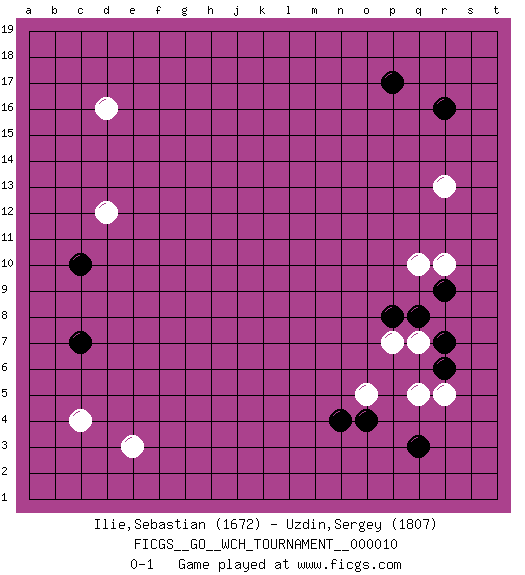 Last move : 0-1 2013 September 14 1:52:13 [Event "FICGS__GO__WCH_TOURNAMENT__000010"] [Site "FICGS"] [Date "2013.07.02"] [Round "1"] [Black "Ilie,Sebastian"] [White "Uzdin,Sergey"] [Result "0-1"] [Rating 1 "1672"] [Rating 2 "1807"] 1.r16 c4 2.q3 e3 3.p17 d16 4.c10 r5 5.r7 q7 6.q8 p7 7.r6 q5 8.o4 o5 9.n4 d12 10.c7 r10 11.r9 q10 12.p8 r13 0-1 This go game has been lost on time (started : 2013.07.02 23:31:25) Here are the names of the openings (joseki) played in the four corners : Corner q4 : q3 r5 Komoku (Somok, Xiao~mu`) 3-4 Point. The komoku (3-4) point is the traditional corner enclosure move.. Ikken Kakari (Hankan Keolch'im, Yi Gua`jiao~, 1-Space Low Pincer). The small knight move is the basic approach move to the 3-4 point stone. It has been continually used for over four centuries. There are limitless variations, with new moves constantly being discovered. White 2 opens the door to a treaure store of joseki. Player White won this Go (weiqi, baduk) game. Follow this game move after move (download)The simplest move is the best move. (Anonymous) When you stop learning you start dying. (M. Scott Adams)