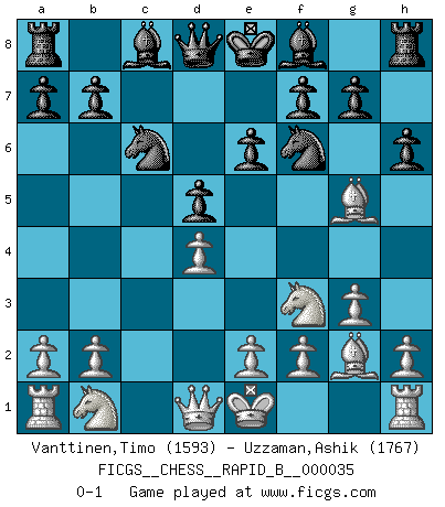 Last move : 0-1 2007 March 16 8:1:29 [Event "FICGS__CHESS__RAPID_B__000035"] [Site "FICGS"] [Date "2007.02.04"] [Round "1"] [White "Vanttinen,Timo"] [Black "Uzzaman,Ashik"] [Result "0-1"] [WhiteElo "1593"] [BlackElo "1767"] 1.c4 Nf6 2.d4 c6 3.g3 d5 4.cxd5 cxd5 5.Bg2 Nc6 6.Bg5 e6 7.Nf3 h6 0-1 This chess game has been lost on time (started : 2007.02.04 8:52:41) English, 1...Nf6 (Anglo-Indian defense) Player Black won this chess game. Follow this game move after move (download)The boy (then a 12 year old boy named Anatoly Karpov) doesn't have a clue about Chess, and there's no future at all for him in this profession. (Mikhail Botvinnik) Bis jetzt ist Weiß einer wohlbekannten Analyse gefolgt. Aber jetzt begeht er einen schrecklichen Fehler: Er beginnt seinen eigenen Kopf zu benutzen. (Siegbert Tarrasch) Un mal día en el Ajedrez, es mejor que cualquier buen día en el trabajo. (Anonymous) Vous savez, camarade Pachman, je n'éprouve pas de plaisir à être ministre, je jouerais plutôt aux échecs comme vous, ou alors ferais une révolution au Venezuela. (Che Guevara à Ludek Pachman, 'Checkmate in Prague', 1975) Good luck. You're gonna need it. (Han Solo in Star Wars ep.6)