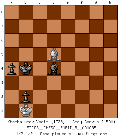 Last move : 1/2-1/2 2007 June 19 18:53:38 [Event "FICGS__CHESS__RAPID_B__000035"] [Site "FICGS"] [Date "2007.02.04"] [Round "1"] [White "Khachaturov,Vadim"] [Black "Gray,Garvin"] [Result "1/2-1/2"] [WhiteElo "1733"] [BlackElo "1500"] 1.d4 Nf6 2.c4 e6 3.Nc3 c5 4.d5 exd5 5.cxd5 d6 6.Nf3 g6 7.Bf4 a6 8.e4 b5 9.Bd3 Bg4 10.h3 Bxf3 11.Qxf3 Bg7 12.O-O O-O 13.Rfe1 c4 14.Bc2 Nh5 15.Bh2 Re8 16.Qe3 Qc7 17.g4 Nf6 18.Qf4 Rd8 19.g5 Nh5 20.Qe3 Nd7 21.Rac1 Rac8 22.a3 Re8 23.Kh1 Nc5 24.f4 Qb7 25.Rcd1 a5 26.e5 b4 27.Ne4 Nxe4 28.Qxe4 b3 29.Bb1 c3 30.bxc3 Rxc3 31.Rd3 Rxd3 32.Qxd3 b2 33.Kg2 dxe5 34.fxe5 Rc8 35.Qe4 Rc1 36.Rf1 Qb5 37.Rf3 Rd1 38.d6 Bf8 39.a4 Rd2+ 40.Rf2 Rxf2+ 41.Kxf2 Qd7 42.Kg2 Qc8 43.Bg1 Qc1 44.Be3 Qe1 45.Bf2 Qd2 46.h4 Nf4+ 47.Kf3 Ne6 48.Be3 Qe1 49.Kg2 Bg7 50.Bd3 Qc3 51.d7 Bxe5 52.Qa8+ Kg7 53.h5 gxh5 54.Qe4 h4 55.Kf2 Qc7 56.Qxh7+ Kf8 57.Qh6+ Ke7 58.Qxh4 Kxd7 59.g6 fxg6 60.Bxg6 Qc3 61.Bf5 Kd6 62.Qe4 Nd4 63.Bxd4 Bxd4+ 64.Ke2 Qc4+ 65.Qd3 Qd5 66.Qe4 Qxe4+ 67.Bxe4 Kc5 68.Kd2 Kb4 69.Kc2 Kxa4 70.Kb1 Kb4 71.Bd5 a4 1/2-1/2 Queen's pawn game Kingside Castling by player White (move 12) Kingside Castling by player Black (move 12) 10 pieces endgame at move 63 : White KQBBP , Black KQBPP WHITE : King + 1 Queen 2 Bishops 1 Pawn BLACK : King + 1 Queen 1 Bishop 2 Pawns 9 pieces endgame at move 63 : White KQBP , Black KQBPP WHITE : King + 1 Queen 1 Bishop 1 Pawn BLACK : King + 1 Queen 1 Bishop 2 Pawns 8 pieces endgame at move 66 : White KBP , Black KQBPP WHITE : King + 1 Bishop 1 Pawn BLACK : King + 1 Queen 1 Bishop 2 Pawns 7 pieces endgame at move 67 : White KBP , Black KBPP WHITE : King + 1 Bishop 1 Pawn BLACK : King + 1 Bishop 2 Pawns 6 pieces endgame at move 69 : White KB , Black KBPP WHITE : King + 1 Bishop BLACK : King + 1 Bishop 2 Pawns This chess game ended in a draw. Follow this game move after move (download)Why must I lose to this idiot ? (Aron Nimzovich) Es gibt zwei Arten von Opfern: Korrekte und meine. (Mikhail Nekhemyevich Tal) Los Peones son el alma de una partida de Ajedrez. (Francois Andre Danican Philidor) Il n'y a plus de joueurs du niveau de Jacob Murray dont la seule quête est le beau jeu, le plaisir de voir les pièces construire quelque chose. Sur 10 idées à la minute, 9 seront sans intérêt, la dernière s'avèrera géniale. (Christian Bauer) Before all elsed, be armed. (Niccolo Machiavelli)