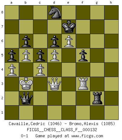 Last move : 0-1 2013 July 8 22:16:28 [Event "FICGS__CHESS__CLASS_F__000132"] [Site "FICGS"] [Date "2013.07.04"] [Round "1"] [White "Cavaille,Cedric"] [Black "Bromo,Alexis"] [Result "0-1"] [WhiteElo "1046"] [BlackElo "1085"] 1.e4 e5 2.Nf3 Nc6 3.d4 d6 4.Bb5 Bd7 5.d5 Na5 6.Bxd7+ Qxd7 7.O-O Nf6 8.Qe1 b6 9.Bg5 Be7 10.b3 h6 11.Bxf6 Bxf6 12.c4 c5 13.Qc3 O-O 14.a3 Nb7 15.b4 a6 16.a4 Rfb8 17.b5 a5 18.Nbd2 Kf8 19.Rae1 Ke7 20.Re3 g5 21.h3 Rh8 22.g4 Rag8 23.Kg2 h5 24.gxh5 Rxh5 25.Rh1 g4 26.Nxe5 gxh3+ 27.Kf1 Bxe5 28.Qd3 h2 29.Qe2 Rg1+ 30.Rxg1 hxg1Q+ 31.Kxg1 Rg5+ 32.Kf1 Bh2 33.Nf3 Qh3+ 34.Ke1 Rg6 35.Nxh2 Qxh2 36.Kd2 Nd8 37.e5 Rg1 38.e6 f6 39.f4 Qxf4 40.Qd3 Rg2+ 41.Kc3 f5 42.Rf3 Qc1+ 43.Kb3 Qb2+ 0-1 Scotch Opening Kingside Castling by player White (move 7) Kingside Castling by player Black (move 13) Promotion Queen by player Black (move 30) Player Black won this chess game. Follow this game move after move (download)A Chess game is a dialogue, a conversation between a player and his opponent. Each move by the opponent may contain threats or be a blunder, but a player cannot defend against threats or take advantage of blunders if he does not first ask himself: What is my opponent planning after each move ? (Bruce A. Moon) Karpov ist ein Museumsstück. (Garry Kasparov) Una compensación adecuada por un sacrificio es tener una combinación sólida que conduce a una posición ganadora; una compensación adecuada por una metida de pata es dejar a tu oponente arrebatar una derrota de las fauces de la victoria. (Bruce A. Moon) Echiquier : carré parfait, comme la Jérusalem nouvelle décrite par l'auteur de l'Apocalypse, huit cases sur huit, exaltation du chiffre 4, symbole du cosmos aux quatre horizons... où le noir et le blanc, l'ombre et la lumière, le mal et le bien s'entremêlent et se conjuguent. (Robert Couffignal, Le Gambit du poète) . 'gn is not allowed in chess unless n is an integer between 1 and 8 inclusive, where 1 and 8 are to interpreted as the standard numerals standing for integers in the ordered real-closed field R, with the *canonical* ordering. (As opposed to, say, an integer in the domain Z[2+i*sqrt(5)] or an integer in some exotic Grothendieck topos). (Normajean Yates)