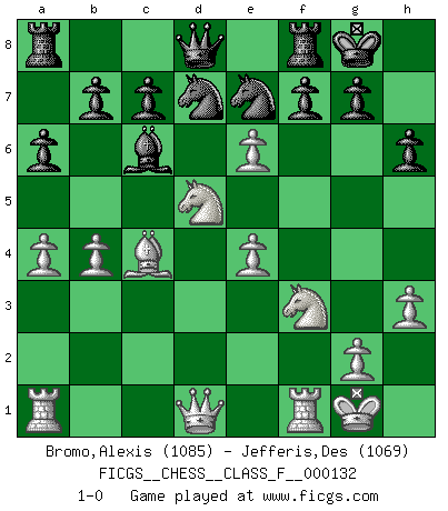 Last move : 1-0 2013 October 1 3:5:40 [Event "FICGS__CHESS__CLASS_F__000132"] [Site "FICGS"] [Date "2013.07.04"] [Round "1"] [White "Bromo,Alexis"] [Black "Jefferis,Des"] [Result "1-0"] [WhiteElo "1085"] [BlackElo "1069"] 1.d4 e6 2.c4 d5 3.Nc3 dxc4 4.e4 Nf6 5.Bxc4 Bd7 6.Nf3 h6 7.Be3 Bb4 8.e5 Ng8 9.a3 Ba5 10.b4 Bb6 11.O-O Ne7 12.a4 a6 13.d5 Bxe3 14.fxe3 exd5 15.Nxd5 O-O 16.h3 Bc6 17.e4 Nd7 18.e6 1-0 This chess game has been lost on time (started : 2013.07.04 23:33:29) Queen's pawn Kingside Castling by player White (move 11) Kingside Castling by player Black (move 15) Player White won this chess game. Follow this game move after move (download)Fischer Chess play was always razor-sharp, rational and brilliant. One of the best ever. (Dave Regis) Konzentriere dich auf materielle Gewinne. Nimm, was dir dein Gegner gibt, ausser es gibt einen guten Grund der dagegenspricht. (Robert James Fischer) Un mal plan es mejor que no tener ningún plan. (Frank Marshall) Les échecs sont utiles à l'exercice de la faculté de penser et à celle de l'imagination. Car nous devons posséder une méthode élaborée pour atteindre des buts partout où nous devons conduire notre raison. (Leibnitz) Lottery : A tax on people who are bad at math. (Author unknown)
