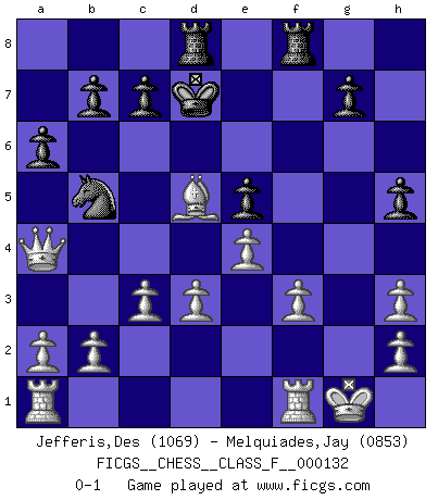 Last move : 0-1 2013 September 27 3:4:8 [Event "FICGS__CHESS__CLASS_F__000132"] [Site "FICGS"] [Date "2013.07.04"] [Round "1"] [White "Jefferis,Des"] [Black "Melquiades,Jay"] [Result "0-1"] [WhiteElo "1069"] [BlackElo "0853"] 1.e4 e5 2.Nf3 a6 3.Bc4 d5 4.Bxd5 Ne7 5.Bb3 Nbc6 6.Ng5 Ng6 7.Nxf7 Ke7 8.Nxd8 Kxd8 9.d3 h5 10.Bg5+ Be7 11.Bxe7+ Ngxe7 12.Nc3 Nd4 13.O-O Bg4 14.f3 Bh3 15.gxh3 Rf8 16.Nd5 Nxd5 17.Bxd5 Kd7 18.c3 Nb5 19.Qa4 Rad8 0-1 This chess game has been lost on time (started : 2013.07.04 23:33:29) King's knight Opening Kingside Castling by player White (move 13) Player Black won this chess game. Follow this game move after move (download)If a ruler does not understand Chess, how can he rule over a kingdom ? (King Khusros II) Der vorletzte Fehler gewinnt. (Savielly Grigorievitsch Tartakower) Haz el enroque temprano y seguido. (Rob Sillars) Le temps de noter son nom sur la feuille de partie, j'étais déjà en zeitnot ! D'un modeste amateur apparié lors de la première ronde d'un open contre le grand-maître Azmaïparashvili. If only faces could talk... (Pat Summerall, Sportscaster during the Super Bowl)