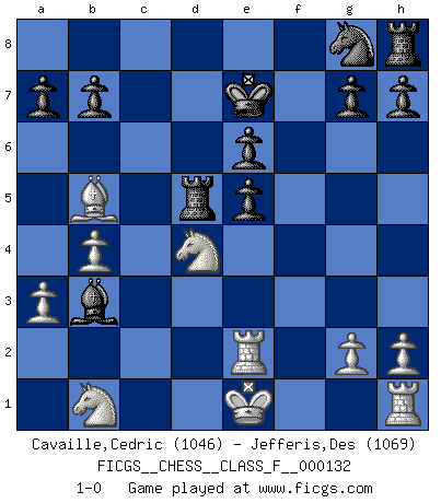 Last move : 1-0 2013 September 28 15:5:58 [Event "FICGS__CHESS__CLASS_F__000132"] [Site "FICGS"] [Date "2013.07.04"] [Round "1"] [White "Cavaille,Cedric"] [Black "Jefferis,Des"] [Result "1-0"] [WhiteElo "1046"] [BlackElo "1069"] 1.e4 e6 2.d4 d5 3.e5 c5 4.c4 dxc4 5.dxc5 Qxd1+ 6.Kxd1 Bxc5 7.Bxc4 Bxf2 8.b4 Nc6 9.a3 Nxe5 10.Bb2 f6 11.Bxe5 fxe5 12.Bd3 Bd7 13.Nf3 Bd4 14.Ra2 Bc6 15.Bc4 Bd5 16.Bb5+ Ke7 17.Re2 Bb3+ 18.Kd2 Rd8 19.Ke1 Rd5 20.Nxd4 1-0 This chess game has been lost on time (started : 2013.07.04 23:33:29) French : Advance variation Player White won this chess game. Follow this game move after move (download)Even the laziest King flees wildly in the face of a double check ! (Aaron Nimzowitsch) Ein Kibitz ist einer, der deinem Gegner gute Ratschläge gibt. (Andrew Soltis) Un buen jugador siempre tiene buena suerte. (José Raúl Capablanca) Les Echecs, c'est l'art de la guerre sans les charniers, c'est la résurrection des morts tombés au champ d'honneur, l'espoir perpétuel, la suprématie de l'intelligence sur la force, la culture de l'esprit. (F. Szpiner) It is the aim of the modern school, not to treat every position according to one general law, but according to the principle inherent in the position. (Richard Reti)