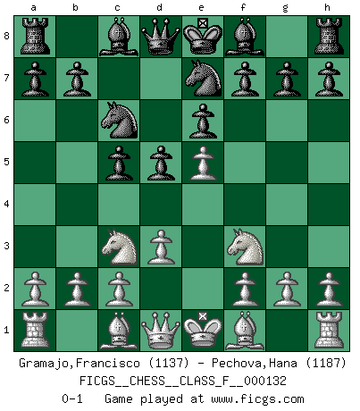 Last move : 0-1 2013 September 9 1:30:35 [Event "FICGS__CHESS__CLASS_F__000132"] [Site "FICGS"] [Date "2013.07.04"] [Round "1"] [White "Gramajo,Francisco"] [Black "Pechova,Hana"] [Result "0-1"] [WhiteElo "1137"] [BlackElo "1187"] 1.e4 c5 2.Nc3 Nc6 3.d3 e6 4.Nf3 d5 5.e5 Nge7 0-1 This chess game has been lost on time (started : 2013.07.04 23:33:29) Sicilian : Closed, 2...Nc6 Player Black won this chess game. Follow this game move after move (download)When you absolutely don't know what to do anymore, it is time to panic. (John van der Wiel) Du musst Deinen Gegner in einen tiefen dunklen Wald führen wo 2+2=5 ist und wo der Weg, der wieder hinausführt, nur breit genug für einen ist. (Mikhail Nekhemyevich Tal) El jugador táctico sabe que hacer cuando hay algo que hacer; mientras que el estratega sabe que hacer cuando no hay nada que hacer. (Gerald Abrahams) Mais l'homme est une créature légère et illogique : semblable au joueur d'échecs, il n'aime que le processus du but à atteindre, non le but lui-même. (Dostoïevsky) A specialist learns more and more about less and less until he knows everything about nothing. (Nicholas Murray Butler)