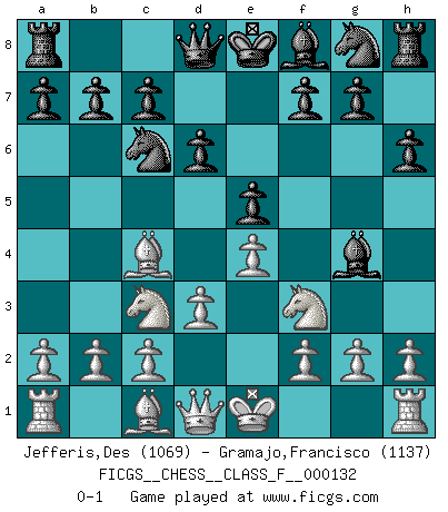 Last move : 0-1 2013 September 11 13:46:20 [Event "FICGS__CHESS__CLASS_F__000132"] [Site "FICGS"] [Date "2013.07.04"] [Round "1"] [White "Jefferis,Des"] [Black "Gramajo,Francisco"] [Result "0-1"] [WhiteElo "1069"] [BlackElo "1137"] 1.e4 e5 2.Nf3 Nc6 3.Bc4 h6 4.d3 d6 5.Nc3 Bg4 0-1 This chess game has been lost on time (started : 2013.07.04 23:33:29) King's pawn game Player Black won this chess game. Follow this game move after move (download)Openings teach you openings. Endgames teach you chess ! (Stephan Gerzadowicz) Ein Teil des Fehlers ist immer korrekt. (Savielly Grigorievitsch Tartakower) Si tu oponente te ofrece un empate, trata de averiguar porque piensa él que esta en una posición peor. (Nigel Short) La victoire dans une partie d'Echecs appartient la plupart du temps à celui qui voit un peu plus loin que l'adversaire. (Lasker) Fear is the path to the dark side. Fear leads to anger; anger leads to hate; hate leads to suffering. I sense much fear in you. (Master Yoda in Star Wars ep.1)