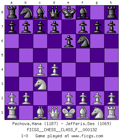 Last move : 1-0 2013 September 13 1:48:32 [Event "FICGS__CHESS__CLASS_F__000132"] [Site "FICGS"] [Date "2013.07.04"] [Round "1"] [White "Pechova,Hana"] [Black "Jefferis,Des"] [Result "1-0"] [WhiteElo "1187"] [BlackElo "1069"] 1.c4 e6 2.Nc3 Nf6 3.d4 1-0 This chess game has been lost on time (started : 2013.07.04 23:33:29) English Opening Player White won this chess game. Follow this game move after move (download)When I asked Fischer why he had not played a certain move in our game, he replied: 'Well, you laughed when I wrote it down !' (Mikhail Tal) Ich rechne überhaupt nicht voraus. Ich gewinne auch so. (Robert James Fischer) No es tiempo de jugar al Ajedrez cuando la casa esta en llamas. (Proverbio Italiano) L'action d'une oeuvre littéraire se déroule sur un champ de bataille. Les masques et les types du drame moderne correspondent aux pièces du jeu d'échecs. L'intrigue correspond aux coups et aux gambits, c'est à dire aux techniques du jeu telles qu'utilisées et interprétées par les joueurs. Les tactiques et les péripéties [mouvements] correspondent aux coups exécutés par l'adversaire. (Viktor Shklovsky) The hypothalamus is one of the most important parts of the brain, involved in many kinds of motivation, among other functions. The hypothalamus controls the 'Four Fs: Fighting, Fleeing, Feeding and Mating. (Unknown author)