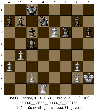 Last move : 1-0 2013 November 23 7:57:1 [Event "FICGS__CHESS__CLASS_F__000132"] [Site "FICGS"] [Date "2013.07.04"] [Round "1"] [White "Dotti Contra,Alessandro"] [Black "Pechova,Hana"] [Result "1-0"] [WhiteElo "1137"] [BlackElo "1187"] 1.e4 c6 2.d4 d5 3.Nc3 dxe4 4.Nxe4 Bf5 5.Bd3 Qxd4 6.Nf3 Qd8 7.Bg5 Bxe4 8.Bxe4 Qxd1+ 9.Rxd1 h6 10.Bh4 Nf6 11.Bd3 e6 12.O-O Nbd7 13.Rfe1 O-O-O 14.Bg3 Bc5 15.a3 Nh5 16.Ne5 Nxg3 17.Nxf7 Rhf8 18.Bg6 Rxf7 19.Bxf7 Rf8 20.hxg3 Rxf7 21.Rxe6 Rxf2 22.b4 Rf6 23.Kh2 1-0 This chess game has been lost on time (started : 2013.07.04 23:33:29) Caro-Kann : Classical variation Kingside Castling by player White (move 12) Queenside Castling by player Black (move 13) Player White won this chess game. Follow this game move after move (download)If I win a tournament, I win it by myself. I do the playing. Nobody helps me. (Bobby Fischer) Es hat in meinem Leben Zeiten gegeben, da ich sehr nahe daran war zu glauben, daß ich auch nicht eine einzige Schachpartie verlieren könnte. (José Raúl Capablanca) Morphy probablemente fue el genio más grande de todos. (Bobby Fischer) Le joueur d'Echecs qui veut atteindre le top est obligé de développer son propre credo créatif. Alexeï Stepanovicth Souétine. Il est facile d'écrire des livres ! Ce qui est difficile, c'est de jouer ! (Alexeï Stepanovicth Souétine) I live to kill Traxler counterattack. (Ilmars Cirulis)