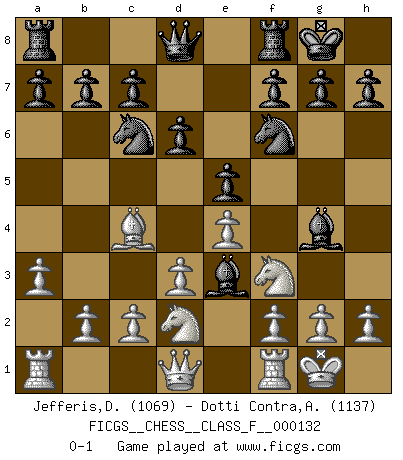 Last move : 0-1 2013 August 23 12:26:4 [Event "FICGS__CHESS__CLASS_F__000132"] [Site "FICGS"] [Date "2013.07.04"] [Round "1"] [White "Jefferis,Des"] [Black "Dotti Contra,Alessandro"] [Result "0-1"] [WhiteElo "1069"] [BlackElo "1137"] 1.e4 e5 2.Nf3 Nc6 3.Bc4 Nf6 4.d3 Bc5 5.Be3 d6 6.a3 Bg4 7.Nbd2 O-O 8.O-O Bxe3 0-1 This chess game has been lost on time (started : 2013.07.04 23:33:29) Two knights defense (Modern Bishop's Opening) Kingside Castling by player Black (move 7) Kingside Castling by player White (move 8) Player Black won this chess game. Follow this game move after move (download)Chess is a fairy tale of 1001 blunders. (Savielly Tartakower) Wenn sie aufgeben, dann danke ich Ihnen für das Spiel (Eventualzug beim Fernschach). (Anonymous) Bobby solo arroja las piezas y solas caen en las casillas correctas. (Miguel Najdorf ) Mais n'est-ce pas déjà le limiter injurieusement que d'appeler les échecs un jeu? N'est-ce pas aussi une science, un art, ou quelque chose qui, comme le cercueil de Mahomet entre ciel et terre, est suspendu entre l'un et l'autre, et qui réunit un nombre incroyable de contraires ? (Stefan Zweig) Don't be irreplaceable, if you can't be replaced, you can't be promoted. (Dan Rotaru)