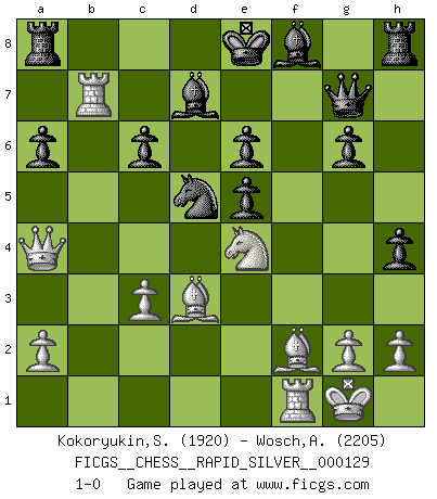 Last move : 1-0 2013 September 5 14:21:9 [Event "FICGS__CHESS__RAPID_SILVER__000129"] [Site "FICGS"] [Date "2013.07.05"] [Round "1"] [White "Kokoryukin,Sergey"] [Black "Wosch,Arkadiusz"] [Result "1-0"] [WhiteElo "1920"] [BlackElo "2205"] 1.e4 c5 2.Nf3 Nc6 3.d4 cxd4 4.Nxd4 Nf6 5.Nc3 d6 6.Bg5 e6 7.f4 a6 8.Nxc6 bxc6 9.e5 h6 10.Bh4 g5 11.fxg5 Nd5 12.Ne4 Qb6 13.c3 dxe5 14.g6 fxg6 15.Bf2 Qxb2 16.Rb1 Qa3 17.Qg4 Qe7 18.Bd3 Qg7 19.O-O h5 20.Qd1 h4 21.Qa4 Bd7 22.Rb7 1-0 Sicilian defense Kingside Castling by player White (move 19) Player White won this chess game. Follow this game move after move (download)Though most people love to look at the games of the great attacking masters, some of the most successful players in history have been the quiet positional players. They slowly grind you down by taking away your space, tying up your pieces, and leaving you with virtually nothing to do ! (Yasser Seirawan) Spiel ein langweiliges Spiel zu Ende und lustige Dinge können passieren. (Hans Ree) Buenas posiciones no logran ganar juegos, buenas movidas sí. (Gerald Abrahams) Même si vous avez un bon coup à faire, regardez toujours s'il n'y en a pas un qui lui soit préférable. (Pedro Damiano) History is the quarrels of popes and kings, with wars or pestilences in every page; the men all so good for nothing, and hardly any women at all. (Jane Austen)