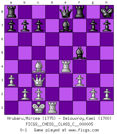 Last move : 0-1 2006 June 11 10:3:45 [Event "FICGS__CHESS__CLASS_C__000005"] [Site "FICGS"] [Date "2006.05.20"] [Round "1"] [White "Hrubaru,Mircea"] [Black "Delouvroy,Kael"] [Result "0-1"] [WhiteElo "1775"] [BlackElo "1700"] 1.e4 e6 2.d4 d5 3.Nc3 Bb4 4.Nge2 dxe4 5.a3 Be7 6.Nxe4 Nf6 7.Qd3 O-O 8.Bf4 Nc6 9.O-O-O e5 10.Be3 Ng4 11.f3 Nxe3 12.Qxe3 Nxd4 13.Nxd4 exd4 14.Rxd4 Qe8 15.Qc3 f5 16.Bc4+ Kh8 17.Rhd1 fxe4 18.Rxe4 Bf5 0-1 French : Winawer (Nimzovich) variation Kingside Castling by player Black (move 7) Queenside Castling by player White (move 9) Player Black won this chess game. Follow this game move after move (download)The hallmark of the artist is simplicity. (Larry Evans) Mein erstes Ziel war nicht, die Partie zu gewinnen, sondern eine Figur zu opfern. -- der junge (Wilhelm Steinitz) Hasta este punto, las blancas han seguido un análisis bien conocido. Pero ahora el hace un error fatal: empieza a usar su propia cabeza. (Siegbert Tarrasch) La vérité est comme le meilleur coup aux échecs : elle existe, mais il faut la chercher. (Arturo Perez-Reverte) Now the reason the enlightened prince and the wise general conquer the enemy whenever they move and their achievements surpass those of ordinary men is foreknowledge. (Sun Tzu)