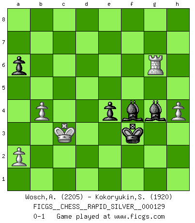 Last move : 0-1 2013 November 2 0:23:44 [Event "FICGS__CHESS__RAPID_SILVER__000129"] [Site "FICGS"] [Date "2013.07.05"] [Round "2"] [White "Wosch,Arkadiusz"] [Black "Kokoryukin,Sergey"] [Result "0-1"] [WhiteElo "2205"] [BlackElo "1920"] 1.e4 c5 2.Nf3 d6 3.d4 cxd4 4.Nxd4 Nf6 5.Nc3 a6 6.Be3 e6 7.f3 b5 8.Qd2 Nbd7 9.g4 b4 10.Nce2 h6 11.O-O-O Qc7 12.h4 d5 13.exd5 Nxd5 14.Nf4 N7b6 15.Kb1 Bc5 16.Nxd5 Nxd5 17.Bc4 Bb7 18.Bxd5 Bxd5 19.c4 bxc3 20.Qxc3 Rc8 21.Nf5 Bxe3 22.Nxg7+ Kf8 23.Nxe6+ fxe6 24.Qxh8+ Kf7 25.Qh7+ Kf6 26.Qxc7 Rxc7 27.Rd3 Bb6 28.b3 Ke5 29.Rf1 Kf4 30.Kb2 Bc5 31.Rh1 Be7 32.Rh3 Bf6+ 33.Kb1 Rc3 34.Rxc3 Bxc3 35.g5 Bg7 36.Rh2 Bxf3 37.Kc2 e5 38.gxh6 Bxh6 39.Rd2 Kg3 40.Rd6 Bf4 41.Rg6+ Bg4 42.b4 e4 43.Kc3 Kf3 0-1 Sicilian : Najdorf, Byrne (English) attack Queenside Castling by player White (move 11) 10 pieces endgame at move 38 : White KRPPP , Black KBBPP WHITE : King + 1 Rook 3 Pawns BLACK : King + 2 Bishops 2 Pawns Player Black won this chess game. Follow this game move after move (download)All that matters on the Chessboard is good moves. (Bobby Fischer) Wenn du auf das Glück wartest, wird das Leben ziemlich langweilig. (Mikhail Nekhemyevich Tal) Juega la Apertura como un libro, el Juego Medio como un mago y los Finales como una máquina. (Spielmann) Le plus grand jeu de l'esprit jamais inventé, plus vous l'apprenez, plus vous y prenez du plaisir. (Garry Kasparov) A shortcut is the longest distance between two points. (Don Groves)
