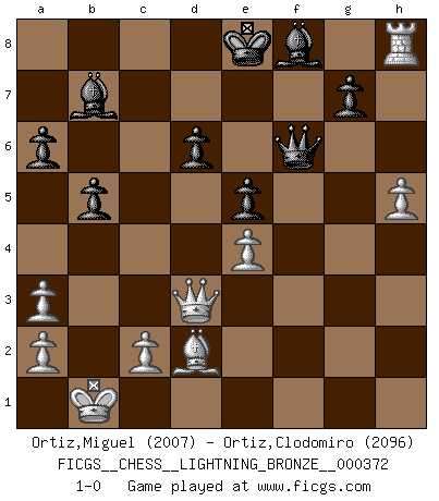Last move : 1-0 2013 July 5 15:8:50 [Event "FICGS__CHESS__LIGHTNING_BRONZE__000372"] [Site "FICGS"] [Date "2013.07.05"] [Round "1"] [White "Ortiz,Miguel"] [Black "Ortiz,Clodomiro"] [Result "1-0"] [WhiteElo "2007"] [BlackElo "2096"] 1.e4 c5 2.Nf3 e6 3.d4 cxd4 4.Nxd4 Nc6 5.Nc3 d6 6.g4 a6 7.Be3 Nge7 8.Nb3 b5 9.f4 Bb7 10.Qe2 Na5 11.O-O-O Nc4 12.Kb1 Rc8 13.f5 Qc7 14.Bc1 Na3+ 15.bxa3 Qxc3 16.Rd3 Qc7 17.Bh3 Nc6 18.fxe6 fxe6 19.g5 Ne5 20.Re3 Nc4 21.Rg3 e5 22.g6 hxg6 23.Qg4 Rxh3 24.Rxh3 Qd7 25.Qxg6+ Qf7 26.Qg2 Rc7 27.Rh8 Qe6 28.Rf1 Rf7 29.h4 Rxf1 30.Qxf1 Qf7 31.Qd3 Qg6 32.h5 Qf6 33.Nd2 Nxd2+ 34.Bxd2 1-0 Sicilian : Taimanov variation Queenside Castling by player White (move 11) Player White won this chess game. Follow this game move after move (download)Play the opening like a book, the middle game like a magician, and the endgame like a machine. (Spielmann) Schach ist ein schwarz-weisser Dschungel. (Garry Kasparov) Tu cuerpo tiene que estar en óptima condición. Tu Ajedrez se deteriora como lo hace tu cuerpo. No puedes separar la mente y el cuerpo. (Bobby Fischer) RxDa4 pat (...) Good decisions come from experience, and experience comes from bad decisions. (Anonymous)