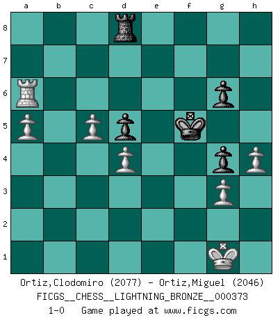 Last move : 1-0 2013 July 5 17:54:29 [Event "FICGS__CHESS__LIGHTNING_BRONZE__000373"] [Site "FICGS"] [Date "2013.07.05"] [Round "1"] [White "Ortiz,Clodomiro"] [Black "Ortiz,Miguel"] [Result "1-0"] [WhiteElo "2077"] [BlackElo "2046"] 1.d4 f5 2.g3 e6 3.Nf3 Nf6 4.Bg2 a6 5.c4 Bb4+ 6.Nc3 O-O 7.O-O Bxc3 8.bxc3 d6 9.Rb1 Nc6 10.Qc2 Rb8 11.c5 Bd7 12.Ba3 Ne4 13.Ne1 d5 14.Nd3 Qe7 15.Bc1 Na5 16.Bf4 Be8 17.Ne5 Nc6 18.Rfd1 Nxe5 19.Bxe5 Bb5 20.a4 Bc6 21.c4 Qe8 22.Ra1 Rf7 23.cxd5 Bxd5 24.a5 Bc6 25.Rd3 Rd8 26.Rb1 Bb5 27.Qb2 Qd7 28.Re3 Bc6 29.Rb3 Bb5 30.Rb4 Rdf8 31.Qc2 h6 32.Bf3 Qd5 33.Qc1 Rc8 34.Qf4 Bc6 35.Qe3 Rd8 36.R1b2 Rdf8 37.Qc1 Rd8 38.Qf4 Rc8 39.Bg2 Qd7 40.Qe3 Rb8 41.Qd3 Qd8 42.Qc2 Qe8 43.h4 Re7 44.Bf3 Kh7 45.Rb1 Kg8 46.Bg2 Qh5 47.Rd1 Qf7 48.Re1 Qg6 49.Rc1 Qe8 50.e3 Qh5 51.Re1 Rd8 52.Reb1 Bb5 53.R4b2 Qg6 54.Bf1 c6 55.f3 Nf6 56.Qb3 Nd5 57.Bd3 Rf7 58.Rf2 Bxd3 59.Qxd3 Qh5 60.Kg2 Qg6 61.Rfb2 R8d7 62.Rb3 Qh5 63.Qe2 Qg6 64.Qd2 Qh5 65.Qd3 Qg6 66.R3b2 Kh7 67.Kg1 Kg8 68.Rf1 Rf8 69.Kg2 R8f7 70.Rc1 Rf8 71.Re1 Qh5 72.Qb3 Qg6 73.Kh3 Rdf7 74.Bd6 Rd8 75.Rbe2 R8d7 76.e4 fxe4 77.Rxe4 Rf6 78.f4 Rdf7 79.Qf3 h5 80.Kh2 Qh6 81.Bb8 Rg6 82.R4e2 Rgf6 83.Be5 Rf5 84.Qd3 Nb4 85.Qb3 Nd5 86.Bd6 R5f6 87.Qd3 Nb4 88.Qc4 Nd5 89.Be5 Rf5 90.Qc2 Nb4 91.Qc3 Nd5 92.Qa3 Qg6 93.Bd6 R5f6 94.Qf3 Qh6 95.Rb2 Rd7 96.Be5 Rf5 97.Qb3 Qg6 98.Rbe2 Rdf7 99.Re4 Qg4 100.Qd3 Qg6 101.Bb8 R5f6 102.Qf3 Qh6 103.Bd6 Qg6 104.R1e2 Rd7 105.Re5 Qf7 106.Kh3 Rh6 107.Rg5 Kh8 108.Be5 Nf6 109.Kg2 Rd8 110.Qd3 Rd7 111.Qb3 Kg8 112.Qb1 Kh8 113.Qd3 Kg8 114.Re1 Re7 115.Qc2 Rd7 116.Qb3 Kh8 117.Qd3 Rd8 118.Kg1 Kg8 119.Qb3 Rd7 120.Re3 Kh7 121.Qc2+ Kh8 122.f5 exf5 123.Qxf5 Rd8 124.Qb1 Re8 125.Qc2 Re7 126.Qe2 Kg8 127.Qf1 Kh8 128.Qd3 Re8 129.Re2 Rf8 130.Rf2 Re8 131.Rf1 Rd8 132.Bd6 Qa2 133.Re5 Ng4 134.Re2 Qg8 135.Rf5 Rh7 136.Qf3 g6 137.Rf4 Qd5 138.Qxd5 cxd5 139.Re6 Rg7 140.Rxg4 hxg4 141.Be5 Kh7 142.Bxg7 Kxg7 143.Re7+ Kf6 144.Rxb7 Ke6 145.Rb6+ Kf5 146.Rxa6 1-0 Dutch defense Kingside Castling by player Black (move 6) Kingside Castling by player White (move 7) Player White won this chess game. Follow this game move after move (download)The game of chess is the touchstone of the intellect. (Goethe) Meine Liebe ist Schach, Schach, Schach. Ich muss jeden Tag Schach spielen, deshalb fühle ich mich so stark. (Miguel Najdorf) Haz el enroque temprano y seguido. (Rob Sillars) Pour se monter efficace, un Cavalier a besoin d'avant-postes ! Les Cavaliers font les meilleurs bloqueurs de pions passés. Man with more than one clock never knows what time it is. (Chinese thought)