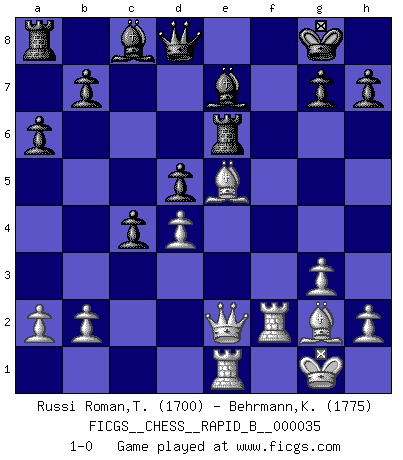 Last move : 1-0 2007 April 11 4:45:0 [Event "FICGS__CHESS__RAPID_B__000035"] [Site "FICGS"] [Date "2007.02.04"] [Round "1"] [White "Russi Roman,Tano-Urayoan"] [Black "Behrmann,Klaus"] [Result "1-0"] [WhiteElo "1700"] [BlackElo "1775"] 1.Nf3 d5 2.d4 Nf6 3.c4 e6 4.g3 dxc4 5.Bg2 a6 6.Ne5 Bb4+ 7.Nc3 Nd5 8.Bd2 Nb6 9.e3 Bd6 10.f4 N8d7 11.O-O O-O 12.Qe2 Nxe5 13.fxe5 Be7 14.Rf2 c5 15.Rd1 cxd4 16.exd4 f6 17.exf6 Rxf6 18.Bf4 Nd5 19.Nxd5 exd5 20.Re1 Re6 21.Be5 1-0 Reti Opening Kingside Castling by player White (move 11) Kingside Castling by player Black (move 11) Player White won this chess game. Follow this game move after move (download)It was clear to me that the vulnerable point of the American Grandmaster (Bobby Fischer) was in double-edged, hanging, irrational positions, where he often failed to find a win even in a won position. (Efim Geller) Viele Opfer benötigen überhaupt keine konkrete Berechnung. Es genügt sich die entstehende Position kurz vorzustellen, um uns davon zu überzeugen, dass das Opfer korrekt ist. (Mikhail Nekhemyevich Tal) Mi estilo es algo parecido entre un poco de Tal y Petrosian. (Reshevsky) Demandez au pauvre Cg1 ce qu'il en pense. Eduard Gufeld à propos de la variante Saemisch de l'Est-Indienne. At last I discovered the true beauty of chess. So I proposed to her. (Dinesh De Silva)
