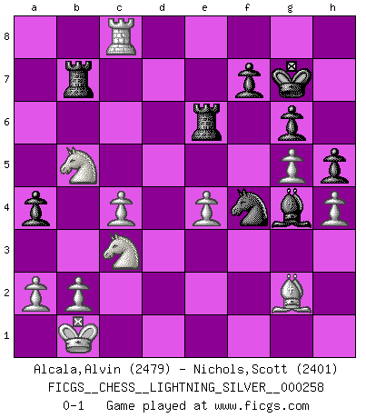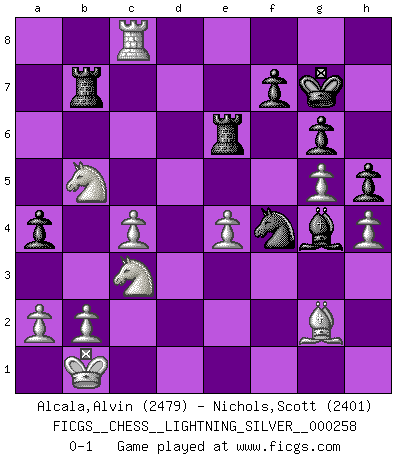Last move : 0-1 2013 July 7 23:38:24 [Event "FICGS__CHESS__LIGHTNING_SILVER__000258"] [Site "FICGS"] [Date "2013.07.07"] [Round "1"] [White "Alcala,Alvin"] [Black "Nichols,Scott"] [Result "0-1"] [WhiteElo "2479"] [BlackElo "2401"] 1.c4 Nf6 2.Nc3 g6 3.d4 Bg7 4.e4 d6 5.f3 O-O 6.Be3 e5 7.d5 Nfd7 8.Nh3 Bh6 9.Bxh6 Qh4+ 10.Nf2 Qxh6 11.Ng4 Qh4+ 12.g3 Qe7 13.Qd2 h5 14.Ne3 Nf6 15.h4 Nbd7 16.g4 Nc5 17.Qg2 a5 18.O-O-O a4 19.Kb1 Qd8 20.g5 Nfd7 21.Qd2 Nb6 22.Be2 Rb8 23.Rdf1 c6 24.Rd1 Nbd7 25.Nc2 Qc7 26.Rhf1 Qb6 27.Qe1 Ra8 28.Qf2 Qc7 29.Na3 Rd8 30.Rd2 Nb6 31.f4 exf4 32.Qxf4 Qe7 33.Ka1 Bh3 34.Rf2 Bc8 35.Bd1 Ra6 36.Qg3 Nbd7 37.dxc6 bxc6 38.Rxd6 Re8 39.Rfd2 Ne5 40.Qf2 Nb7 41.R6d4 Nc5 42.Bf3 Bg4 43.Bg2 R6a8 44.Rd6 Qa7 45.Qd4 Nb7 46.Qxa7 Rxa7 47.Rf6 Nc5 48.Kb1 Kg7 49.R2d6 Rb7 50.Rxc6 Nxc6 51.Rxc6 Nd3 52.Nab5 Re6 53.Rc8 Nf4 0-1 English Opening Kingside Castling by player Black (move 5) Queenside Castling by player White (move 18) Player Black won this chess game. Follow this game move after move (download)There are two types of sacrifices: correct ones and mine. (Mikhail Tal) Wenn sie aufgeben, dann danke ich Ihnen für das Spiel (Eventualzug beim Fernschach). (Anonymous) El Ajedrez no es como la vida... ¡tiene reglas!. (Mark Pasternak) 'L'échange des dames est un coup dur pour les deux adversaires...' Un journaliste lors d'une partie du match Spassky-Fischer A government big enough to give you everything you want is strong enough to take everything you have. (Thomas Jefferson)