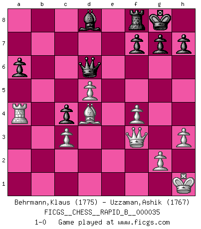 Last move : 1-0 2007 May 13 9:6:40 [Event "FICGS__CHESS__RAPID_B__000035"] [Site "FICGS"] [Date "2007.02.04"] [Round "1"] [White "Behrmann,Klaus"] [Black "Uzzaman,Ashik"] [Result "1-0"] [WhiteElo "1775"] [BlackElo "1767"] 1.e4 c5 2.f4 Nc6 3.Nc3 d6 4.Nf3 Nf6 5.Bb5 Bg4 6.d3 a6 7.Bxc6+ bxc6 8.h3 Bxf3 9.Qxf3 Qc7 10.O-O Rb8 11.e5 Nd7 12.exd6 exd6 13.Re1+ Be7 14.b3 Nf6 15.Bb2 O-O 16.Ne4 Nxe4 17.dxe4 c4 18.Bd4 c5 19.Bc3 cxb3 20.axb3 c4 21.b4 Qb6+ 22.Kh1 d5 23.exd5 Bxb4 24.Reb1 Qc5 25.Be5 Rb6 26.c3 Ba5 27.Bd4 Rxb1+ 28.Rxb1 Qd6 29.Ra1 Bd8 30.Ra4 1-0 This chess game has been lost on time (started : 2007.02.04 8:52:41) Sicilian : Grand Prix attack Kingside Castling by player White (move 10) Kingside Castling by player Black (move 15) Player White won this chess game. Follow this game move after move (download)A chess genius has died; a loss for humanity. (Viktor Kortchnoi, about Bobby Fischer's death) Meine Liebe ist Schach, Schach, Schach. Ich muss jeden Tag Schach spielen, deshalb fühle ich mich so stark. (Miguel Najdorf) No soy una persona materialista y por eso, no resiento la falta o pérdida del dinero. La ausencia de cosas mundanas carece de importancia. Ya que el Ajedrez es una forma en la que puedo ser tan materialista como yo desee sin tener la necesidad de vender mi alma. (Jamie Walter Adams) L'attaque fait le spectacle, la défense gagne les matchs. (Dicton footballistique) Waiting for chance ? Play in casinos. (FICGS proverb)