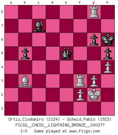 Last move : 1-0 2013 July 10 1:37:14 [Event "FICGS__CHESS__LIGHTNING_BRONZE__000377"] [Site "FICGS"] [Date "2013.07.09"] [Round "1"] [White "Ortiz,Clodomiro"] [Black "Schmid,Pablo"] [Result "1-0"] [WhiteElo "2124"] [BlackElo "1923"] 1.d4 Nf6 2.c4 g6 3.Nc3 d5 4.cxd5 Nxd5 5.e4 Nxc3 6.bxc3 c5 7.Nf3 Bg7 8.Rb1 O-O 9.Be2 cxd4 10.cxd4 Qa5+ 11.Bd2 Qxa2 12.O-O Bg4 13.Be3 Nc6 14.d5 Bxf3 15.Bxf3 Ne5 16.Be2 Nc4 17.Bg5 Nd6 18.Bxe7 Nxe4 19.Bf3 Nc3 20.Ra1 Qc4 21.Qc2 a5 22.d6 a4 23.Rfe1 Rfd8 24.Ra3 Rd7 25.Rc1 Rc8 26.Rxa4 Qc5 27.R4a1 Be5 28.g3 Bxd6 29.Bf6 Be5 30.Bg4 Bxf6 31.Bxd7 Rd8 32.Bg4 Qd5 33.Ra3 Qg5 34.Bf3 Rd2 35.Rxc3 Rxc2 36.R3xc2 b6 37.Kg2 Bd4 38.Rc7 Qd2 39.R1c2 Qd3 40.Ra2 Bc5 41.Ra8+ Kg7 42.R8a7 Qf5 43.Rd7 Qf6 44.Rac7 Qf5 45.h4 h5 46.Rb7 Qf6 47.Ra7 Qf5 48.Rd2 Kh6 49.Rb7 Qf6 50.Rc7 Qe6 51.R2d7 Bd6 52.Rb7 Kg7 53.Ra7 b5 54.Rdb7 Bc5 55.Ra5 Qe1 56.Ra2 Qe6 57.Rd2 Qe1 58.Rc2 Qb4 59.Bd5 Kh6 60.Rxf7 Qd4 61.Bb3 Qe4+ 62.Rf3 Qe5 63.Ra2 Bd6 64.Ra8 Bc7 65.Rg8 1-0 King's Indian defense, 3.Nc3 Kingside Castling by player Black (move 8) Kingside Castling by player White (move 12) Player White won this chess game. Follow this game move after move (download)In Chess, as it is played by masters, chance is practically eliminated. (Emanuel Lasker) Mein Gehirn das ist mein zweitwichtigstes Organ [Aus dem Film: Der Schläfer]. (Woody Allen) Una clavada es mas poderosa que una espada. (Fred Reinfeld) Votre prénom est 'Tactique', votre deuxième prénom est 'Tactique' et votre nom est 'Tactique'. (Ken Smith) To send light into the darkness of men's hearts - such is the duty of the artist. (Schumann)