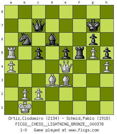 Last move : 1-0 2013 July 10 2:54:4 [Event "FICGS__CHESS__LIGHTNING_BRONZE__000378"] [Site "FICGS"] [Date "2013.07.10"] [Round "1"] [White "Ortiz,Clodomiro"] [Black "Schmid,Pablo"] [Result "1-0"] [WhiteElo "2134"] [BlackElo "1918"] 1.e4 c5 2.Nf3 d6 3.d4 cxd4 4.Nxd4 Nf6 5.Nc3 g6 6.Be3 Bg7 7.f3 O-O 8.Qd2 Nc6 9.O-O-O d5 10.Qe1 e5 11.Nxc6 bxc6 12.exd5 Nxd5 13.Bc4 Be6 14.Ne4 Qc7 15.Bc5 Rfd8 16.Qh4 h6 17.g4 Rd7 18.Ba3 Re8 19.g5 Qd8 20.Bb3 Bf5 21.Bc5 a5 22.Ba4 Re6 23.Rhf1 h5 24.Rf2 Bh6 25.Rg2 Nb6 26.Rxd7 Nxd7 27.Be3 Bf8 28.Rd2 Qc7 29.Qf2 Bb4 30.Rd3 Re8 31.a3 Be7 32.Rc3 Bxe4 33.fxe4 c5 34.Kb1 Rf8 35.Bb5 Rb8 36.Bc4 Rf8 37.a4 Kg7 38.Bb5 f5 39.exf5 Rxf5 40.Qg2 Nb6 41.Bd3 Rf7 42.Qe4 Rf5 43.Rb3 Bf8 44.Rb5 Be7 45.h4 Bd6 46.Rxa5 1-0 Sicilian : Dragon, Yugoslav attack, 7...O-O Kingside Castling by player Black (move 7) Queenside Castling by player White (move 9) Player White won this chess game. Follow this game move after move (download)In order to improve your game, you must study the endgame before everything else, for whereas the endings can be studied and mastered by themselves, the middle game and the opening must be studied in relation to the endgame. (Jose Raul Capablanca) Ich weiss nicht was Gott gegen mich auf 1.e4 antworten würde. (Robert James Fischer) Después de una mala apertura, hay una esperanza en el juego medio. Pero una vez que estas en finales, el momento de la verdad ha llegado. (Edmar Mednis) Des combinaisons [dans le jeu d'échecs] pareilles à des mélodies. Je crois entendre pour ainsi dire la musique des coups... (Vladimir Nabokov) Lottery : A tax on people who are bad at math. (Author unknown)