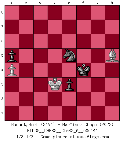 Last move : 1/2-1/2 2014 April 7 19:35:42 [Event "FICGS__CHESS__CLASS_A__000141"] [Site "FICGS"] [Date "2013.07.10"] [Round "1"] [White "Basant,Neel"] [Black "Martinez,Chapo"] [Result "1/2-1/2"] [WhiteElo "2194"] [BlackElo "2072"] 1.e4 c5 2.Nf3 Nc6 3.d4 cxd4 4.Nxd4 Nf6 5.Nc3 e5 6.Ndb5 d6 7.Bg5 a6 8.Na3 b5 9.Bxf6 gxf6 10.Nd5 f5 11.Bd3 Be6 12.O-O Bxd5 13.exd5 Ne7 14.Nxb5 Bg7 15.Nc3 e4 16.Bc4 O-O 17.Qh5 Qc7 18.Bb3 Bxc3 19.bxc3 f4 20.c4 Ng6 21.Qf5 Rfe8 22.Kh1 Re5 23.Qg4 a5 24.a4 Rae8 25.Rab1 Kg7 26.c3 Qd8 27.Bc2 Qc8 28.Qe2 Rg5 29.Rg1 R8e5 30.Rbe1 Rh5 31.g4 Rh3 32.Bxe4 Nh4 33.Qf1 Rxc3 34.f3 Qxc4 35.Qf2 Ng6 36.Qb2 Re3 37.Qa1 Nh4 38.Rxe3 fxe3 39.Rc1 Qe2 40.f4 Nf3 41.Rc2 Qe1+ 42.Qxe1 Nxe1 43.fxe5 Nxc2 44.Bd3 dxe5 45.Bc4 Na3 46.Ba6 Kf6 47.Kg2 e4 48.d6 Ke6 49.Bb7 Nc2 50.Kf1 Nd4 51.g5 Kxd6 52.Bxe4 Ke5 53.Bxh7 Nf3 54.g6 fxg6 55.Bxg6 Nxh2+ 56.Ke2 Ng4 57.Kd3 Kf4 58.Bh5 Ne5+ 1/2-1/2 Sicilian : Pelikan (Lasker/Sveshnikov) variation Kingside Castling by player White (move 12) Kingside Castling by player Black (move 16) 10 pieces endgame at move 53 : White KBPPP , Black KNPPP WHITE : King + 1 Bishop 3 Pawns BLACK : King + 1 Knight 3 Pawns 9 pieces endgame at move 54 : White KBPP , Black KNPPP WHITE : King + 1 Bishop 2 Pawns BLACK : King + 1 Knight 3 Pawns 8 pieces endgame at move 55 : White KBPP , Black KNPP WHITE : King + 1 Bishop 2 Pawns BLACK : King + 1 Knight 2 Pawns 7 pieces endgame at move 55 : White KBP , Black KNPP WHITE : King + 1 Bishop 1 Pawn BLACK : King + 1 Knight 2 Pawns This chess game ended in a draw. Follow this game move after move (download)Fischer Chess play was always razor-sharp, rational and brilliant. One of the best ever. (Dave Regis) Es gibt keine einzige Frau, der ich nicht einen Springer vorgeben könnte und trotzdem gewänne. (Robert James Fischer) Me dio la sensación de como si yo estuviera jugando en contra del mismo Ajedrez. - al estar jugando en contra de Robert Fischer (Walter Shipman) Tous ces prétendus hommes politiques sont les pions, les Cavaliers, les Tours ou les Fous d'une partie d'échecs qui se jouera tant qu'un hasard ne renversera pas l'échiquier. (Honoré de Balzac) No, I am still playing. (Anatoly Karpov)