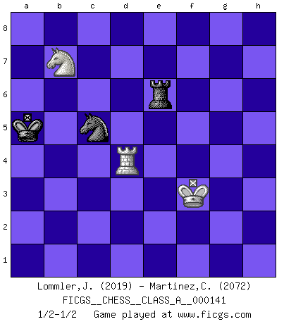 Last move : 1/2-1/2 2014 April 6 1:38:15 [Event "FICGS__CHESS__CLASS_A__000141"] [Site "FICGS"] [Date "2013.07.10"] [Round "1"] [White "Lommler,Jan Peter"] [Black "Martinez,Chapo"] [Result "1/2-1/2"] [WhiteElo "2019"] [BlackElo "2072"] 1.e4 c5 2.Nf3 Nc6 3.d4 cxd4 4.Nxd4 Nf6 5.Nc3 e5 6.Ndb5 d6 7.Nd5 Nxd5 8.exd5 Nb8 9.Be2 a6 10.Nc3 Be7 11.O-O O-O 12.a4 Bf5 13.f4 exf4 14.Bxf4 Nd7 15.Bd3 Bxd3 16.Qxd3 Rc8 17.Rae1 f5 18.Qe3 Rf7 19.Kh1 g6 20.Re2 Nc5 21.Qf3 Bf8 22.Rfe1 Bg7 23.b3 g5 24.Bd2 Be5 25.Qh5 Qf6 26.Bxg5 Qg6 27.Qxg6+ hxg6 28.Re3 Rh7 29.h3 Kf7 30.Rf3 Nd7 31.R1e3 Kg8 32.Bf4 Rc5 33.Rd3 Rh8 34.Kg1 Kg7 35.Ne2 Bxf4 36.Nxf4 Rxc2 37.Rc3 Rc8 38.Rxc8 Rxc8 39.Ne6+ Kf6 40.g4 Ne5 41.g5+ Kf7 42.Rf4 a5 43.h4 Ke7 44.h5 gxh5 45.Nd4 Rc5 46.Nxf5+ Kd7 47.Ng3 Rxd5 48.Nxh5 Rd3 49.b4 Nf3+ 50.Kg2 Nxg5 51.bxa5 Ne6 52.Rb4 Kc7 53.Rc4+ Nc5 54.Nf4 Rd2+ 55.Kf3 Kc6 56.Ng6 Kd5 57.Rh4 Rd3+ 58.Ke2 Rd4 59.Ne7+ Kc4 60.Rh7 Kb4 61.Nf5 Re4+ 62.Kf3 Re6 63.Rh4+ Kxa5 64.Rd4 Nxa4 65.Nxd6 Nc5 66.Nxb7+ 1/2-1/2 Sicilian : Pelikan (Lasker/Sveshnikov) variation Kingside Castling by player White (move 11) Kingside Castling by player Black (move 11) 10 pieces endgame at move 51 : White KRNPP , Black KRNPP WHITE : King + 1 Rook 1 Knight 2 Pawns BLACK : King + 1 Rook 1 Knight 2 Pawns 9 pieces endgame at move 63 : White KRNP , Black KRNPP WHITE : King + 1 Rook 1 Knight 1 Pawn BLACK : King + 1 Rook 1 Knight 2 Pawns 8 pieces endgame at move 64 : White KRN , Black KRNPP WHITE : King + 1 Rook 1 Knight BLACK : King + 1 Rook 1 Knight 2 Pawns 7 pieces endgame at move 65 : White KRN , Black KRNP WHITE : King + 1 Rook 1 Knight BLACK : King + 1 Rook 1 Knight 1 Pawn 6 pieces endgame at move 66 : White KRN , Black KRN WHITE : King + 1 Rook 1 Knight BLACK : King + 1 Rook 1 Knight This chess game ended in a draw. Follow this game move after move (download)When asked, -How is that you pick better moves than your opponents?, I responded: I'm very glad you asked me that, because, as it happens, there is a very simple answer. I think up my own moves, and I make my opponent think up his. (Alexander Alekhine) Schach ist gnadenlos. Du mußt bereit sein zu töten. (Nigel Short) Después de la respuesta de las negras a 1.e4 con 1..e5, se quedan siempre tratando de entrar dentro del juego. (Howard Staunton) Le jeu d'échecs est comme rejeté hors du temps. (Antoine de Saint-Exupéry) When you've done things right people won't know you've done anything at all. (Futurama)