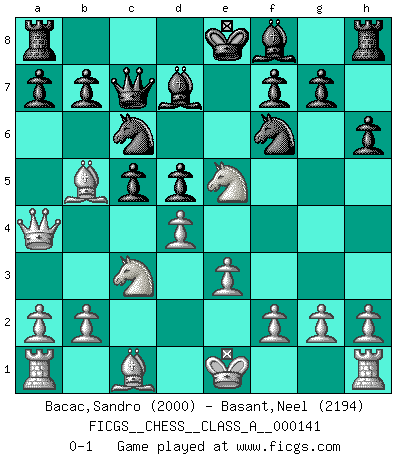 Last move : 0-1 2013 October 2 15:16:20 [Event "FICGS__CHESS__CLASS_A__000141"] [Site "FICGS"] [Date "2013.07.10"] [Round "1"] [White "Bacac,Sandro"] [Black "Basant,Neel"] [Result "0-1"] [WhiteElo "2000"] [BlackElo "2194"] 1.d4 d5 2.c4 e6 3.Nc3 Nf6 4.Nf3 h6 5.e3 c5 6.cxd5 exd5 7.Bb5+ Nc6 8.Ne5 Qc7 9.Qa4 Bd7 0-1 This chess game has been lost on time (started : 2013.07.10 10:40:12) QGD : 4.Nf3 Player Black won this chess game. Follow this game move after move (download)If one piece is badly posted, the whole game is bad. (Tarrasch) Vielleicht wirkt die Aura früherer Spieler glanzvoller als die der heutigen Spieler, aber das liegt daran, dass man kein Programm wie Fritz hatte, das einem all die Löcher in ihren Partien zeigt. (Vladimir Kramnik) Debió haber existido una vez en que los hombres eran semidióses, de otra manera no hubiesen podido inventar el Ajedrez. (Gustav Schenk) Les échecs sont plus proches de l'art de l'assassinat que de l'art de la guerre. (Arturo Perez-Reverte) In fact if nothing is done against this teddy bear, hereby I announce that I would quit chess, rapid chess, blitz chess, postal chess, email chess, server chess and correspondence chess I will then switch to a table game where teddy bears aren't going to be seen for a while, like Poker, or Roulette, all 18+ games. (Elmer Valderrama)