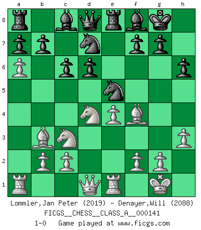 Last move : 1-0 2013 October 12 16:1:31 [Event "FICGS__CHESS__CLASS_A__000141"] [Site "FICGS"] [Date "2013.07.10"] [Round "1"] [White "Lommler,Jan Peter"] [Black "Denayer,Will"] [Result "1-0"] [WhiteElo "2019"] [BlackElo "2088"] 1.e4 d6 2.d4 Nf6 3.Nc3 Nbd7 4.Nf3 e5 5.Bc4 Be7 6.O-O O-O 7.a4 c6 8.a5 h6 9.h3 exd4 10.Nxd4 Re8 11.Bf4 Bf8 12.Re1 Ne5 13.Bb3 Nfd7 14.a6 1-0 Pirc defense Kingside Castling by player White (move 6) Kingside Castling by player Black (move 6) Player White won this chess game. Follow this game move after move (download)Fischer was a master of clarity and a king of artful positioning. His opponents would see where he was going but were powerless to stop him. (Bruce Pandolfini) Wir irren allesamt, nur jeder irrt anders. (Georg Christoph Lichtenberg) Un jugador que es sorprendido, esta derrotado a medias. (Proverbio) Votre prénom est 'Tactique', votre deuxième prénom est 'Tactique' et votre nom est 'Tactique'. (Ken Smith) The difference between perseverance and obstinacy is that one comes from a strong will, and the other from a strong won't. (Henry Ward Beecher)