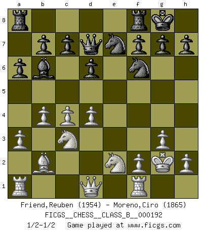 Last move : 1/2-1/2 2014 January 2 12:50:45 [Event "FICGS__CHESS__CLASS_B__000192"] [Site "FICGS"] [Date "2013.07.10"] [Round "1"] [White "Friend,Reuben"] [Black "Moreno,Ciro"] [Result "1/2-1/2"] [WhiteElo "1954"] [BlackElo "1865"] 1.g3 e5 2.c4 Nf6 3.Bg2 Nc6 4.Nc3 Bc5 5.e3 O-O 6.Nge2 d6 7.O-O Bf5 8.d3 Qd7 9.a3 Bh3 10.b4 Bb6 11.d4 a6 12.Bb2 Bxg2 13.Kxg2 exd4 14.exd4 Ne7 1/2-1/2 Benko's Opening Kingside Castling by player Black (move 5) Kingside Castling by player White (move 7) This chess game ended in a draw. Follow this game move after move (download)Chess is a fairy tale of 1001 blunders. (Savielly Tartakower) Wenn Du einsam bist, wenn Du Dich in der Welt wie ein Fremder fühlst, spiele Schach. Das wird Deinen Geist erheben und Dein Ratgeber im Kampf sein. (Aristoteles) El Ajedrez no es como la vida... ¡tiene reglas!. (Mark Pasternak) La conception d'un plan est le processus par lequel un joueur exploite les avantages de sa position tout en s'efforçant d'en réduire au minimum les inconvénients. Afin de garantir le succès, un plan doit toujours se fonder sur un diagnostic objectif des particularités d'une position. La conception d'un plan est d'autant plus difficile que la position est équilibrée, et grandement facilitée lorsqu'il n'existe qu'un seul plan susceptible de répondre aux exigences de la position. (Harry Golombek) In God we trust, all others we virus scan. (Anonymous)