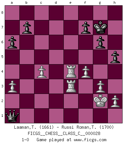 Last move : 1-0 2007 October 27 19:50:59 [Event "FICGS__CHESS__CLASS_C__000028"] [Site "FICGS"] [Date "2007.02.04"] [Round "1"] [White "Laaman,Thomas"] [Black "Russi Roman,Tano-Urayoan"] [Result "1-0"] [WhiteElo "1661"] [BlackElo "1700"] 1.e4 c5 2.Nf3 e6 3.d4 cxd4 4.Nxd4 Nf6 5.Nc3 Nc6 6.Ndb5 Bb4 7.a3 Bxc3 8.Nxc3 d5 9.exd5 exd5 10.Bd3 O-O 11.O-O d4 12.Ne4 Bf5 13.Bg5 Bxe4 14.Bxe4 Qd6 15.Bxf6 Qxf6 16.Qd3 g6 17.Rae1 Rac8 18.f4 Rfe8 19.Re2 Rc7 20.g3 Kg7 21.Rfe1 a6 22.Qc4 d3 23.cxd3 Qd8 24.Bxc6 Rxc6 25.Rxe8 Qb6+ 26.R1e3 Rxc4 27.dxc4 Qxb2 28.R8e7 h5 29.R7e4 Qa1+ 30.Kg2 1-0 Sicilian : Anderssen variation Kingside Castling by player Black (move 10) Kingside Castling by player White (move 11) Player White won this chess game. Follow this game move after move (download)Chess is no whit inferior to the violin, and we have a large number of professional violinists. (Mikhail Botvinnik) Wie gewinnt Tal? Er entwickelt alle seine Figuren in die Brettmitte und opfert sie dann irgendwo. (Robert James Fischer) No es suficiente ser un buen jugador, se debe también de jugar bién. (Siegbert Tarrasch) Les Echecs ont trois composantes : le temps, l'espace et le matériel en dernier. (Mikhail Tal) Whenever people agree with me, I always feel I must be wrong. (Oscar Wilde)