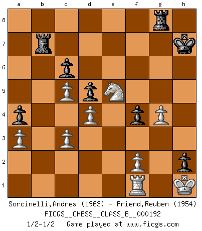 Last move : 1/2-1/2 2014 May 1 17:10:36 [Event "FICGS__CHESS__CLASS_B__000192"] [Site "FICGS"] [Date "2013.07.10"] [Round "1"] [White "Sorcinelli,Andrea"] [Black "Friend,Reuben"] [Result "1/2-1/2"] [WhiteElo "1963"] [BlackElo "1954"] 1.d4 f5 2.Nc3 d5 3.Bf4 c6 4.e3 Nf6 5.Bd3 e6 6.Nf3 Be7 7.O-O O-O 8.Ne2 Ne4 9.h3 Nd7 10.c4 g5 11.Bh2 Bd6 12.Bxd6 Nxd6 13.Rc1 a5 14.Qc2 Qf6 15.Nd2 Kh8 16.c5 Nf7 17.Ng3 Rg8 18.Be2 Qh6 19.Bh5 Rg7 20.Bxf7 Rxf7 21.Qc3 Nf6 22.Nf3 Rg7 23.Qb3 a4 24.Qb6 Bd7 25.Qxb7 Rag8 26.Ne5 f4 27.Ne2 g4 28.exf4 gxh3 29.g3 h2+ 30.Kh1 Be8 31.Qa6 Ne4 32.Qd3 Qh3 33.f5 exf5 34.Nf4 Qh6 35.Rc3 Qf6 36.Qe2 h5 37.Nxh5 Bxh5 38.Qxh5+ Rh7 39.Qd1 Nxc3 40.bxc3 f4 41.a3 Qh6 42.g4 Rb7 43.Qd3 Qh7 44.Qxh7+ Kxh7 1/2-1/2 Dutch Kingside Castling by player White (move 7) Kingside Castling by player Black (move 7) This chess game ended in a draw. Follow this game move after move (download)Chess is war over the board. The object is to crush the opponents mind. (Bobby Fischer) Stelle das Brett so, daß die Sonne in die Augen deines Gegners scheint. (Ruy López) El Ajedrez hace al hombre ser mas sabio y ver mas claro. (Vladimir Putin) En blitz, le Cavalier l'emporte sur le Fou. (Vlastimil Hort) CHESS, n. f. [echecs, Fr.] A nice and abstruse game, in which two sets of puppets are moved in opposition to each other. (Dr Samuel Johnson, A Dictionary Of The English Language, 1755)