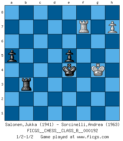 Last move : 1/2-1/2 2013 October 9 16:51:9 [Event "FICGS__CHESS__CLASS_B__000192"] [Site "FICGS"] [Date "2013.07.10"] [Round "1"] [White "Salonen,Jukka"] [Black "Sorcinelli,Andrea"] [Result "1/2-1/2"] [WhiteElo "1941"] [BlackElo "1963"] 1.e4 c5 2.Nf3 d6 3.d4 cxd4 4.Nxd4 Nf6 5.Nc3 a6 6.Be3 e5 7.Nf3 Be7 8.Bc4 O-O 9.O-O Be6 10.Bxe6 fxe6 11.Na4 Ng4 12.Qd3 Nxe3 13.Qxe3 b5 14.Nb6 Ra7 15.Nd5 Rb7 16.Qd2 Bh4 17.Nxh4 Qxh4 18.Ne3 Rd7 19.Qd3 d5 20.exd5 exd5 21.a4 d4 22.Nd1 bxa4 23.Re1 Qe7 24.Rxa4 Qc5 25.b3 Nc6 26.Qc4+ Qxc4 27.Rxc4 Rf6 28.Nb2 Rd5 29.Nd3 Kf7 30.f3 Rb5 31.h4 h5 32.g3 Kg6 33.g4 hxg4 34.fxg4 Kf7 35.Kg2 Ke7 36.g5 Re6 37.Nc5 Rg6 38.c3 dxc3 39.Rxc3 a5 40.Kh3 Rb6 41.Nd3 Re6 42.h5 Kd6 43.Rd1 Ke7 44.Nc5 Rd6 45.Rxd6 Kxd6 46.h6 gxh6 47.gxh6 Nd8 48.h7 Nf7 49.Ne4+ Kd5 50.Rf3 Kxe4 51.Rxf7 Rxb3+ 52.Kg4 1/2-1/2 Sicilian : Najdorf, Byrne (English) attack Kingside Castling by player Black (move 8) Kingside Castling by player White (move 9) 10 pieces endgame at move 47 : White KRNPP , Black KRNPP WHITE : King + 1 Rook 1 Knight 2 Pawns BLACK : King + 1 Rook 1 Knight 2 Pawns 9 pieces endgame at move 50 : White KRPP , Black KRNPP WHITE : King + 1 Rook 2 Pawns BLACK : King + 1 Rook 1 Knight 2 Pawns 8 pieces endgame at move 51 : White KRPP , Black KRPP WHITE : King + 1 Rook 2 Pawns BLACK : King + 1 Rook 2 Pawns 7 pieces endgame at move 51 : White KRP , Black KRPP WHITE : King + 1 Rook 1 Pawn BLACK : King + 1 Rook 2 Pawns This chess game ended in a draw. Follow this game move after move (download)The only thing Chess players have in common is Chess. (Lodewijk Prins) Garry Kasparov war erst in der Großmeister-Organisation GMA, dann in der Profischach-Vereinigung PCA, zum Schluss kehrte er wieder in den Schoß der FIDE zurück. Aber gut, manche Leute sind flexibel (Viswanathan Anand) Muchos jugadores de Ajedrez se sorprendían cuando después de la partida, Fischer explicaba con calma: 'Yo ya había analizado esta posibilidad' en una posición en la cual yo creía que no era posible de prever desde la apertura. (Mikhail Tal) Les Echecs ne sont pas pour les âmes timides. Ils requièrent un homme entier, qui ne s'arrête pas aveuglément à ce qui a été déjà établi, mais qui tente individuellement de sonder les profondeurs du jeu. (W. Steinitz) Life is like a game of cards: the hand you are dealt represents determinism; the way you play it is free will. (Jawaharlal Nehru)