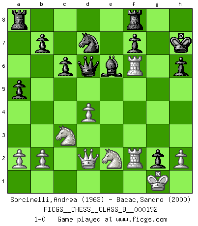 Last move : 1-0 2013 November 2 5:44:23 [Event "FICGS__CHESS__CLASS_B__000192"] [Site "FICGS"] [Date "2013.07.10"] [Round "1"] [White "Sorcinelli,Andrea"] [Black "Bacac,Sandro"] [Result "1-0"] [WhiteElo "1963"] [BlackElo "2000"] 1.d4 d5 2.c4 e6 3.Nc3 Nf6 4.cxd5 exd5 5.Bg5 c6 6.e3 Bd6 7.Bd3 h6 8.Bh4 O-O 9.Nge2 Qe7 10.Qc2 Be6 11.f3 a5 12.e4 dxe4 13.fxe4 g5 14.e5 gxh4 15.exd6 Qxd6 16.Qd2 Kg7 17.O-O Nbd7 18.Rf4 h3 19.Raf1 Nh7 20.Bxh7 hxg2 21.R1f2 Kxh7 22.Rf6 1-0 QGD : Exchange, positional line, 5...c6 Kingside Castling by player Black (move 8) Kingside Castling by player White (move 17) Player White won this chess game. Follow this game move after move (download)Life is like a game of Chess, changing with each move. (Chinese proverb) Als ich elf wurde, wurde ich einfach gut. (Robert James Fischer) ¿Esta Bobby Fischer algo cuerdo?. (Salo Flohr) Les échecs sont un jeu terrible. Si vous n'avez pas le centre, votre adversaire a une position plus libre. Par contre, si vous avez le centre, alors vous avez vraiment quelque chose pour laquelle vous inquiéter ! (Siegbert Tarrasch) A woman without a man is like a fish without a bicycle. (Gloria Steinem)
