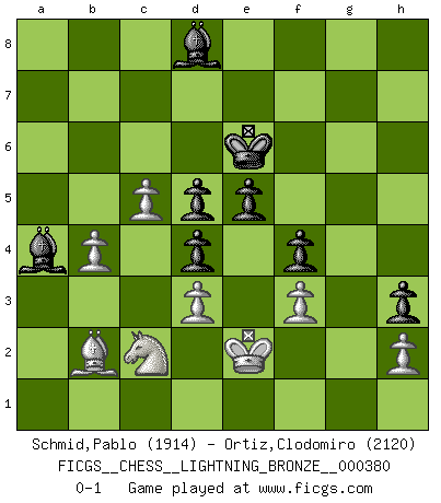 Last move : 0-1 2013 July 10 19:53:38 [Event "FICGS__CHESS__LIGHTNING_BRONZE__000380"] [Site "FICGS"] [Date "2013.07.10"] [Round "1"] [White "Schmid,Pablo"] [Black "Ortiz,Clodomiro"] [Result "0-1"] [WhiteElo "1914"] [BlackElo "2120"] 1.d4 f5 2.Nf3 Nf6 3.c4 e6 4.g3 d5 5.Bg2 c6 6.O-O Bd6 7.b3 Qe7 8.Bb2 b6 9.Ne5 Bb7 10.Nd2 O-O 11.Rc1 a5 12.Nd3 Na6 13.Nf3 Nb4 14.c5 bxc5 15.dxc5 Bc7 16.a3 Nxd3 17.exd3 Nd7 18.b4 axb4 19.axb4 e5 20.Re1 Qf6 21.Qd2 Ba6 22.Ra1 Bb5 23.Bh3 d4 24.Bg2 h6 25.Qc2 Qf7 26.Nd2 Rfb8 27.Rxa8 Rxa8 28.Ra1 Rxa1+ 29.Bxa1 Nb8 30.Qb1 g6 31.Bf1 f4 32.Ne4 g5 33.Bh3 Kg7 34.Bg4 Nd7 35.Kg2 Nf8 36.Kg1 h5 37.Bd1 Nh7 38.gxf4 gxf4 39.Bf3 Nf8 40.Kh1 Qf5 41.Qg1+ Ng6 42.Qg5 Qxg5 43.Nxg5 Bb8 44.Be4 Ne7 45.Nf3 Nd5 46.Bxd5 cxd5 47.Ne1 Kf6 48.f3 Ke6 49.Kg2 Bc7 50.Kf2 Bd8 51.Ke2 h4 52.Bb2 h3 53.Nc2 Ba4 0-1 Dutch Kingside Castling by player White (move 6) Kingside Castling by player Black (move 10) Player Black won this chess game. Follow this game move after move (download)Chess holds its master in its own bonds, shackling the mind and brain so that the inner freedom of the very strongest must suffer. (Albert Einstein) Die unerbitterlichsten Regeln im Schach sind die Ausnahmen. (Savielly Grigorievitsch Tartakower) No nos podemos resistir a la fascinación de un sacrificio ya que la pasión por los sacrificios es parte de la naturaleza de un jugador de Ajedrez. (Rudolf Spielman) Tout change constamment, y compris dans le monde des Echecs. (Botvinnik) The good fighters of old first put themselves beyond the possibility of defeat, and then waited for an opportunity of defeating the enemy. (Sun Tzu)