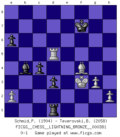Last move : 0-1 2013 July 10 21:7:52 [Event "FICGS__CHESS__LIGHTNING_BRONZE__000381"] [Site "FICGS"] [Date "2013.07.10"] [Round "1"] [White "Schmid,Pablo"] [Black "Teverovski,Bogoljub"] [Result "0-1"] [WhiteElo "1904"] [BlackElo "2058"] 1.d4 Nf6 2.c4 g6 3.Nc3 Bg7 4.e4 d6 5.Nf3 O-O 6.Be2 e5 7.O-O Nc6 8.d5 Ne7 9.b4 Nh5 10.g3 f5 11.Ng5 Nf6 12.Bf3 c6 13.Bg2 h6 14.Ne6 Bxe6 15.dxe6 a6 16.Rb1 fxe4 17.Nxe4 Nxe4 18.Bxe4 b5 19.Qc2 bxc4 20.Bxg6 Nxg6 21.Qxg6 Qf6 22.Qg4 d5 23.f4 exf4 24.Rxf4 Qe5 25.Qg6 Rf6 26.Rxf6 Qxf6 27.Qxf6 Bxf6 28.Bxh6 Re8 29.Re1 Bc3 30.Re2 Bxb4 31.Bc1 d4 32.Re4 d3 33.Rxc4 c5 34.Kg2 Rxe6 35.Kf3 Re5 36.Rg4+ Kf7 37.Rg5 Re1 38.Bf4 c4 39.Rd5 Rd1 0-1 King's Indian : Orthodox, Aronin-Taimanov variation (Yugoslav attack / Mar del Plata variation) Kingside Castling by player Black (move 5) Kingside Castling by player White (move 7) Player Black won this chess game. Follow this game move after move (download)The passion for playing Chess is one of the most unaccountable in the world. (H.G. Wells) Mein erstes Ziel war nicht, die Partie zu gewinnen, sondern eine Figur zu opfern. -- der junge (Wilhelm Steinitz) El Ajedrez es el gimnasio de la mente. (Blaise Pascal) On peut tirer plus d'utilité d'une partie perdue que de 100 parties gagnées. (Capablanca) The real danger is not that computers will begin to think like men, but that men will begin to think like computers. (Sydney J. Harris)