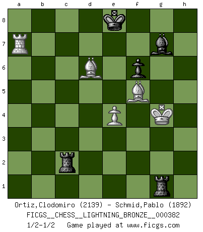 Last move : 1/2-1/2 2013 July 10 23:14:23 [Event "FICGS__CHESS__LIGHTNING_BRONZE__000382"] [Site "FICGS"] [Date "2013.07.10"] [Round "1"] [White "Ortiz,Clodomiro"] [Black "Schmid,Pablo"] [Result "1/2-1/2"] [WhiteElo "2139"] [BlackElo "1892"] 1.d4 Nf6 2.c4 g6 3.Nc3 d5 4.cxd5 Nxd5 5.e4 Nxc3 6.bxc3 c5 7.Nf3 Bg7 8.Rb1 O-O 9.Be2 cxd4 10.cxd4 Qa5+ 11.Bd2 Qxa2 12.O-O Bg4 13.Bg5 h6 14.Be3 Nc6 15.d5 Bxf3 16.Bxf3 Ne5 17.Rxb7 a5 18.Be2 Nc4 19.Bf4 a4 20.Rxe7 g5 21.Bc1 a3 22.h4 Ne5 23.hxg5 hxg5 24.Rb7 Rfc8 25.Bxg5 Qc2 26.d6 Qxd1 27.Rxd1 a2 28.d7 Nxd7 29.Rbxd7 a1Q 30.Rxa1 Rxa1+ 31.Kh2 Ra2 32.Bh5 Rxf2 33.Kg3 R8c2 34.Bf4 Rxg2+ 35.Kh3 f6 36.Rd8+ Kh7 37.Bg4 Kg6 38.Bf5+ Kf7 39.Rd7+ Ke8 40.Ra7 Rg1 41.Bd6 Rh1+ 42.Kg4 Rg1+ 43.Kf3 Rf1+ 44.Kg4 Rg1+ 45.Kf3 Rf1+ 46.Kg4 Rg1+ 1/2-1/2 King's Indian defense, 3.Nc3 Kingside Castling by player Black (move 8) Kingside Castling by player White (move 12) Promotion Queen by player Black (move 29) 10 pieces endgame at move 34 : White KRBBP , Black KRRBP WHITE : King + 1 Rook 2 Bishops 1 Pawn BLACK : King + 2 Rooks 1 Bishop 1 Pawn This chess game ended in a draw. Follow this game move after move (download)It's just you and your opponent at the board and you're trying to prove something. (Bobby Fischer) Ich spiele ehrlich und spiele, um zu gewinnen. Wenn ich verliere nehme ich meine Medizin. (Robert James Fischer) Fischer deseaba darle a los Rusos una sopa de su propia medicina. (Larry Evans) Il s'avisa de me proposer d'apprendre les échecs qu'il jouait un peu... me voilà forcené des échecs. J'achète un échiquier, je m'enferme dans ma chambre, j'y passe des jours et des nuits à vouloir apprendre par cur toutes les parties. (Jean-Jacques Rousseau, Confessions) It's not the size of the dog in the fight, it's the size of the fight in the dog. (Mark Twain)