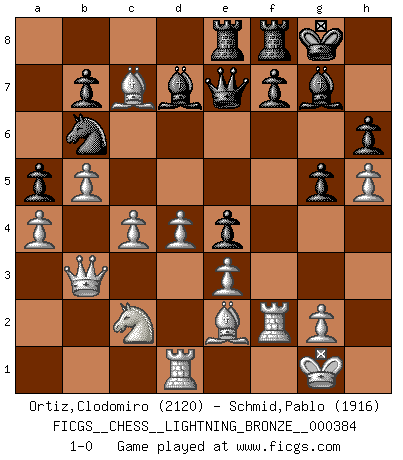 Last move : 1-0 2013 July 11 0:39:44 [Event "FICGS__CHESS__LIGHTNING_BRONZE__000384"] [Site "FICGS"] [Date "2013.07.10"] [Round "1"] [White "Ortiz,Clodomiro"] [Black "Schmid,Pablo"] [Result "1-0"] [WhiteElo "2120"] [BlackElo "1916"] 1.Nf3 Nf6 2.d4 g6 3.Bg5 Bg7 4.Nbd2 d5 5.e3 O-O 6.c3 Nbd7 7.Be2 Re8 8.O-O e5 9.b4 e4 10.Ne1 h6 11.Bf4 a5 12.a4 Nb6 13.Qb3 Bf8 14.h3 Bd7 15.b5 Be6 16.Nc2 Nfd7 17.f3 exf3 18.Rxf3 Nf6 19.R3f1 Qe7 20.Rf2 Rac8 21.Raf1 Bg7 22.Bh2 Nh7 23.Qa2 Ng5 24.h4 Ne4 25.Nxe4 dxe4 26.c4 Rf8 27.h5 g5 28.Rd1 Bd7 29.Qb3 Rce8 30.Bxc7 1-0 Reti Opening Kingside Castling by player Black (move 5) Kingside Castling by player White (move 8) Player White won this chess game. Follow this game move after move (download)Best by test: 1. e4 (Bobby Fischer) Oft bringt ein stiller Zug das Erdbeben. (Richard Reti) El Ajedrez por encima de todo... ¡es una pelea!. (Emanuel Lasker) RxDa4 pat (...) Drag your thoughts away from your troubles... by the ears, by the heels, or any other way you can manage it. (Mark Twain)