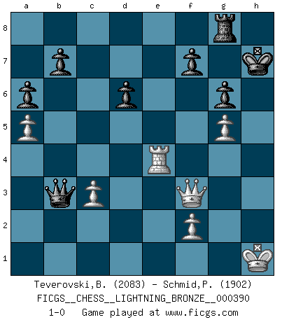 Last move : 1-0 2013 July 11 22:41:52 [Event "FICGS__CHESS__LIGHTNING_BRONZE__000390"] [Site "FICGS"] [Date "2013.07.11"] [Round "1"] [White "Teverovski,Bogoljub"] [Black "Schmid,Pablo"] [Result "1-0"] [WhiteElo "2083"] [BlackElo "1902"] 1.d4 Nf6 2.c4 g6 3.Nc3 d5 4.Nf3 Bg7 5.Qb3 dxc4 6.Qxc4 O-O 7.e4 Be6 8.d5 Bc8 9.Be2 c6 10.O-O cxd5 11.exd5 Nbd7 12.Rd1 Ne8 13.Qb3 Nd6 14.Be3 Qa5 15.a4 Ne5 16.Bg5 Re8 17.Nxe5 Bxe5 18.Nb5 Bd7 19.Bd2 Qd8 20.Rac1 Nxb5 21.Bxb5 Bxb5 22.Qxb5 Rb8 23.Rc2 a6 24.Qe2 Qd6 25.Rc4 Rbc8 26.Bb4 Qf6 27.Re4 Bd6 28.g3 Rc7 29.Ba5 Rc5 30.Bb6 R5c8 31.Re1 Qg5 32.Qd1 Qf5 33.Qd2 h5 34.a5 Kh7 35.Kg2 Qd7 36.Bd4 Rc7 37.Bc3 Rd8 38.h3 Qb5 39.g4 Rg8 40.Kh1 Qd7 41.Qd3 Qb5 42.Qf3 Qxd5 43.Rd1 Rxc3 44.bxc3 hxg4 45.hxg4 Qb3 46.Rxd6 exd6 47.g5 1-0 Comment by player 1 : Bogoljub Teverovski : I wonder why my win in a rated game #74587 is not rated? King's Indian defense, 3.Nc3 Kingside Castling by player Black (move 6) Kingside Castling by player White (move 10) Player White won this chess game. Follow this game move after move (download)The battle for the ultimate truth will never be won. And that's why Chess is so fascinating. (Hans Kmoch) Die starken Figuren des Gegners muss man abtauschen. (José Raúl Capablanca) El Ajedrez, como la música, como el amor, tiene el poder de hacer feliz a la gente. (Siegbert Tarrasch) Si rien de grave n'est détecté lors de l'analyse d'une position, on joue alors le coup. Seconde règle de Blumenfeld. Programmer - an organism that turns coffee into software. (Anonymous)