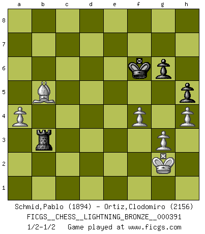 Last move : 1/2-1/2 2013 July 12 22:52:37 [Event "FICGS__CHESS__LIGHTNING_BRONZE__000391"] [Site "FICGS"] [Date "2013.07.12"] [Round "1"] [White "Schmid,Pablo"] [Black "Ortiz,Clodomiro"] [Result "1/2-1/2"] [WhiteElo "1894"] [BlackElo "2156"] 1.Nf3 d5 2.d4 Nf6 3.c4 e6 4.g3 Bb4+ 5.Bd2 a5 6.Bg2 dxc4 7.O-O O-O 8.Bg5 Nc6 9.e3 Be7 10.Nbd2 e5 11.dxe5 Ng4 12.Bxe7 Qxe7 13.Nxc4 Ncxe5 14.Ncxe5 Nxe5 15.Nxe5 Qxe5 16.Qd4 Qe7 17.Rfd1 c6 18.a3 Be6 19.Qe5 Rfe8 20.Rd4 Bb3 21.Qxe7 Rxe7 22.Rc1 R7e8 23.Rc3 Be6 24.Rc5 g6 25.Bf3 Kg7 26.h4 Ra7 27.Kg2 Ra6 28.Be2 R6a8 29.Bf3 a4 30.Bd1 Bd5+ 31.Bf3 Bb3 32.Rd7 Rab8 33.Rc3 Red8 34.Rcd3 Rxd7 35.Rxd7 h5 36.e4 Be6 37.Rd2 c5 38.e5 b5 39.Bc6 b4 40.Bxa4 b3 41.Rd3 c4 42.Rc3 Rd8 43.Bb5 Kf8 44.a4 Rd2 45.Bxc4 Rc2 46.Bxb3 Rxc3 47.Bxe6 Rc2 48.Bd5 Rxb2 49.Bc4 Ke7 50.Bb5 Rb3 51.Ba6 Rc3 52.Bb5 Rc5 53.f4 Rc3 54.Ba6 Ke6 55.Bb5 Ra3 56.Bc4+ Ke7 57.Bb5 f6 58.exf6+ Kxf6 59.Bc6 Rc3 60.Bb5 Rb3 61.Bc4 Rb4 62.Bb5 Rb2+ 63.Kh3 Ra2 64.Bc6 Rd2 65.Bb5 Rc2 66.Be8 Rc3 67.Bb5 Ra3 68.Be8 Re3 69.Bb5 Rb3 70.Be8 Kf5 71.Kg2 Rb2+ 72.Kf3 Kf6 73.Bb5 Rb3+ 74.Kg2 Rb2+ 75.Kf3 Rb3+ 76.Kg2 1/2-1/2 Comment by player 1 : Pablo Schmid : The ending is draw even without the a4 and f4 pawn. Classical fortress. Reti Opening Kingside Castling by player White (move 7) Kingside Castling by player Black (move 7) 10 pieces endgame at move 58 : White KBPPPP , Black KRPP WHITE : King + 1 Bishop 4 Pawns BLACK : King + 1 Rook 2 Pawns This chess game ended in a draw. Follow this game move after move (download)There are two types of sacrifices: correct ones and mine. (Mikhail Tal) Im Reiche der Wirklichkeit ist man nie so glücklich wie im Reiche der Gedanken. (Arthur Schopenhauer) Siempre es mucho mejor sacrificar las piezas de tu oponente. (Savielly Tartakover) On croit qu'il y a plus de mauvais joueurs que de bons joueurs, c'est faux : Il y a autant de joueurs qui gagnent que de joueurs qui perdent. (Philippe Geluck) For to win one hundred victories in one hundred battles is not the acme of skill. To subdue the enemy without fighting is the acme of skill. (Sun Tzu)