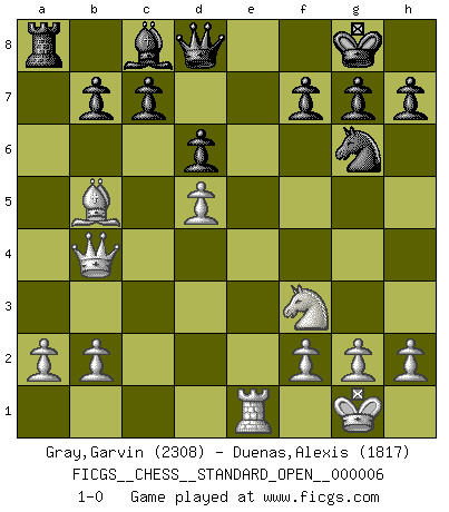 Last move : 1-0 2013 October 5 22:52:11 [Event "FICGS__CHESS__STANDARD_OPEN__000006"] [Site "FICGS"] [Date "2013.07.12"] [Round "1"] [White "Gray,Garvin"] [Black "Duenas,Alexis"] [Result "1-0"] [WhiteElo "2308"] [BlackElo "1817"] 1.e4 e5 2.Nf3 Nc6 3.d4 exd4 4.Bc4 Bc5 5.c3 Nf6 6.cxd4 Bb4+ 7.Nbd2 Bxd2+ 8.Bxd2 Nxe4 9.d5 Ne7 10.Bb4 d6 11.O-O O-O 12.Re1 a5 13.Rxe4 axb4 14.Qe1 Ng6 15.Qxb4 Re8 16.Rxe8+ Qxe8 17.Re1 Qd8 18.Bb5 1-0 Scotch gambit Kingside Castling by player White (move 11) Kingside Castling by player Black (move 11) Player White won this chess game. Follow this game move after move (download)After black's reply to 1.e4 with 1..e5, leaves him always trying to get into the game. (Howard Staunton) Gott hat gewollt, dass ich Champion werde. (Surab Azmajparaschvili) Aquellos que dicen que entienden al Ajedrez, no entienden nada. (Robert Hubner) A chaque perte on perd un peu de soi. (Joël Lautier) They misunderestimated me. (George W. Bush, Bentonville nov. 6, 2000)